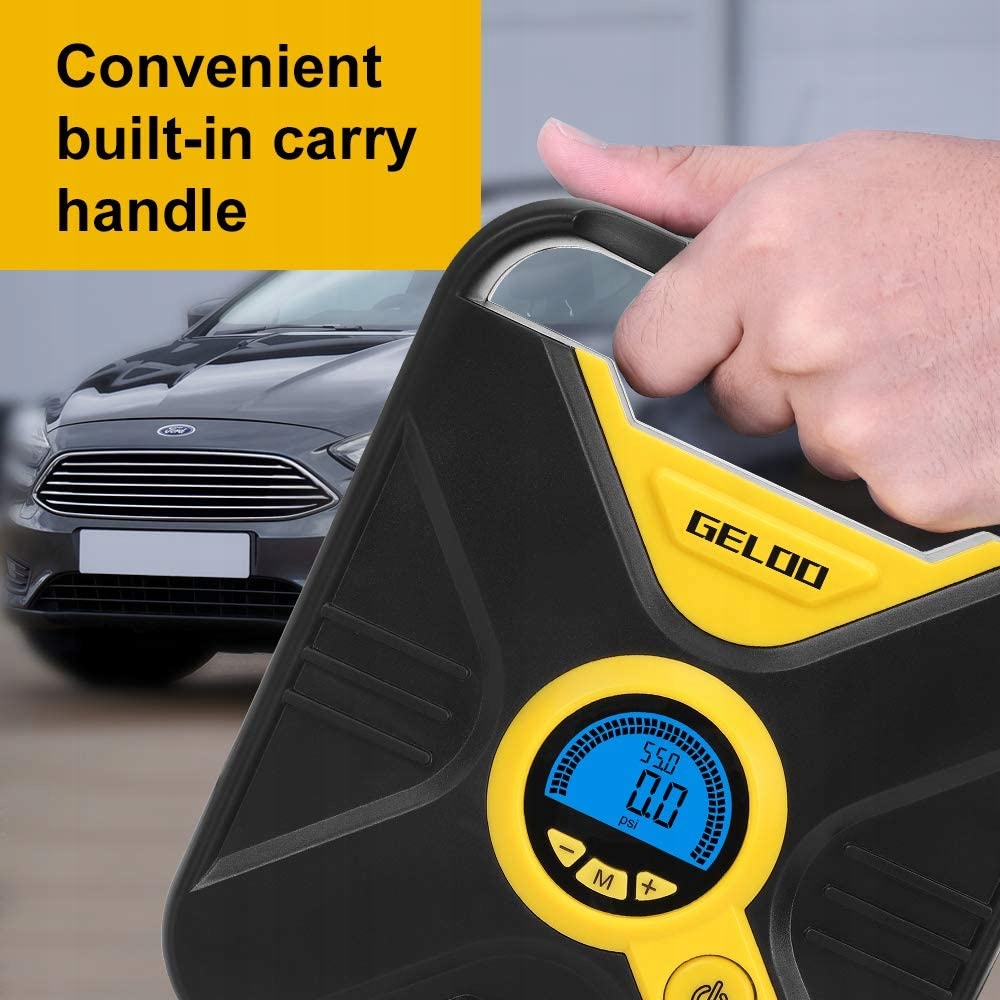 электрический портативный воздушный компрессор 12 В GELOO - ЖК-экран с цифровой подсветкой с регулировкой 4 единицы (бар, кПа, psi, кг / см2) помогает вам проверить давление в шинах в любое время. Насос для шин автоматически отключится при достижении соответствующего давления в шинах.
