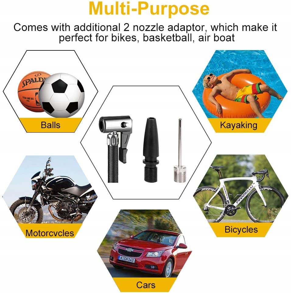 - воздушный насос может легко накачать любую из 4 шин. Лучше всего подходит для автомобилей, велосипедов, мотоциклов, кемперов, внедорожников, квадроциклов (не грузовиков).