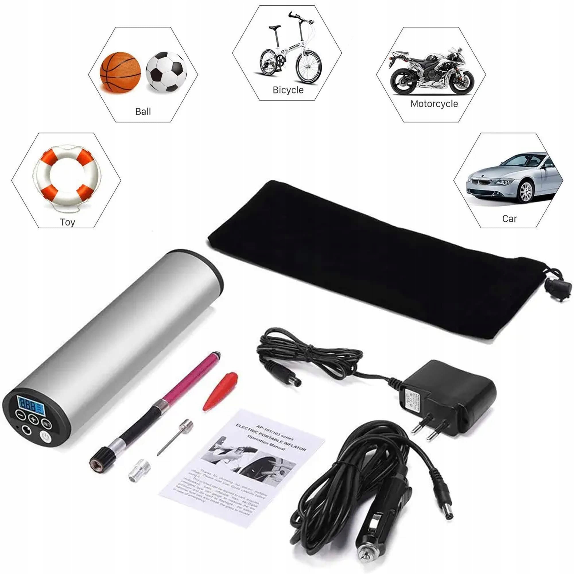 Благодаря различным насадкам можно надувать автомобили, мотоциклы и велосипеды, а также воздушные шары, буи... Время накачивания: примерно 3 минуты для одной пустой автомобильной шины, 1 минута для одной велосипедной шины. 2 светодиодные фонари также позволяют сцеживать молоко в полутьме.