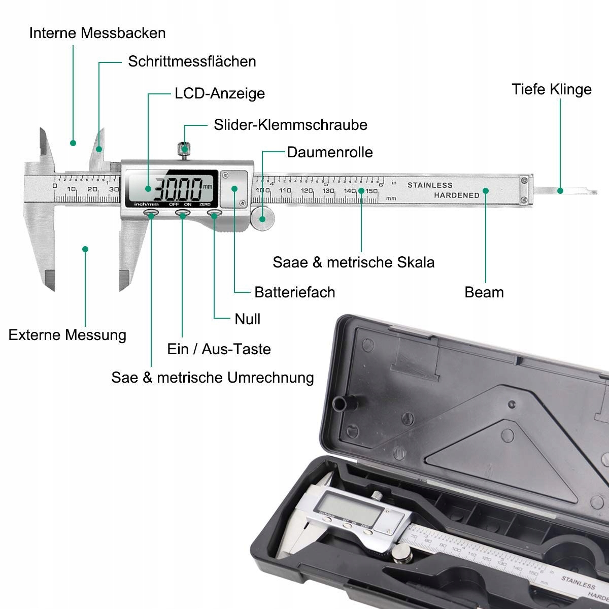 Два режима измерения — цифровые тормозные суппорты из нержавеющей стали (6 дюймов) (0,15 м) с кнопкой MM/IN мгновенно преобразуют дюймы в миллиметры, поэтому вам не придется тратить зря время на расчеты. Ролик с накатанной головкой и установочный винт обеспечивают плавное переключение и точность позиционирования, больше не нужно тратить время на поиск различных измерительных инструментов SAE или метрических деталей.
