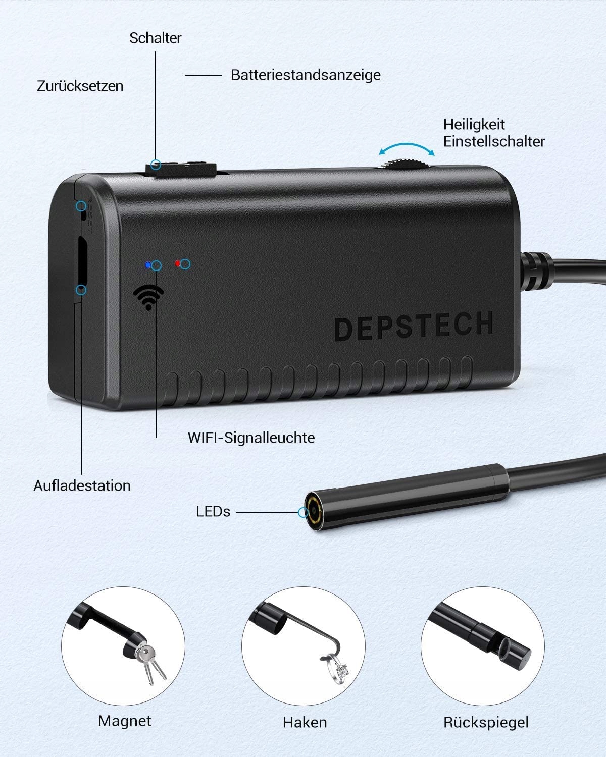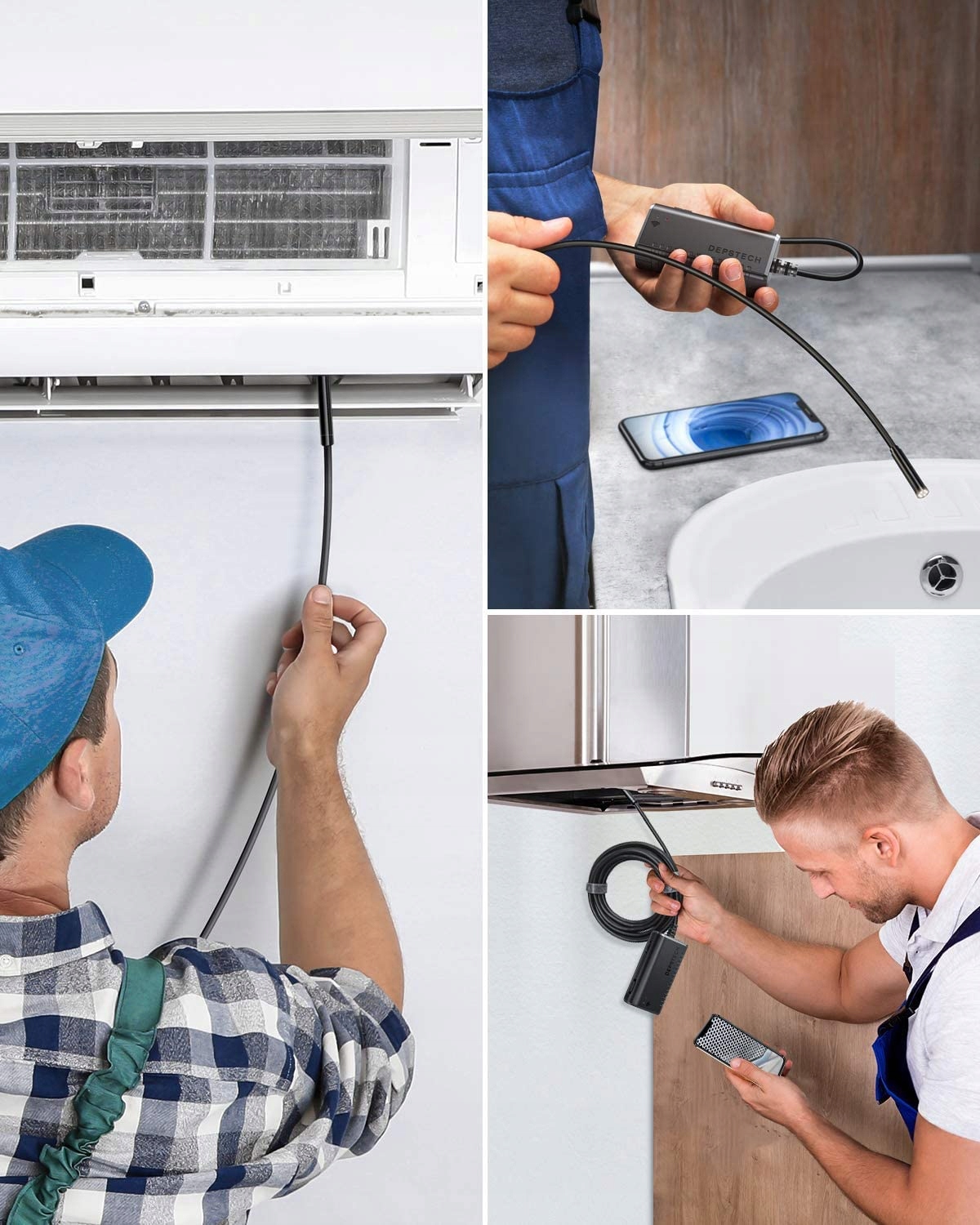Благодаря 6 регулируемым светодиодным источникам света и тонкому водонепроницаемому зонду этот эндоскоп подходит для различных условий, например, для затемненных или темных помещений, влажных или влажных помещений и т. д.