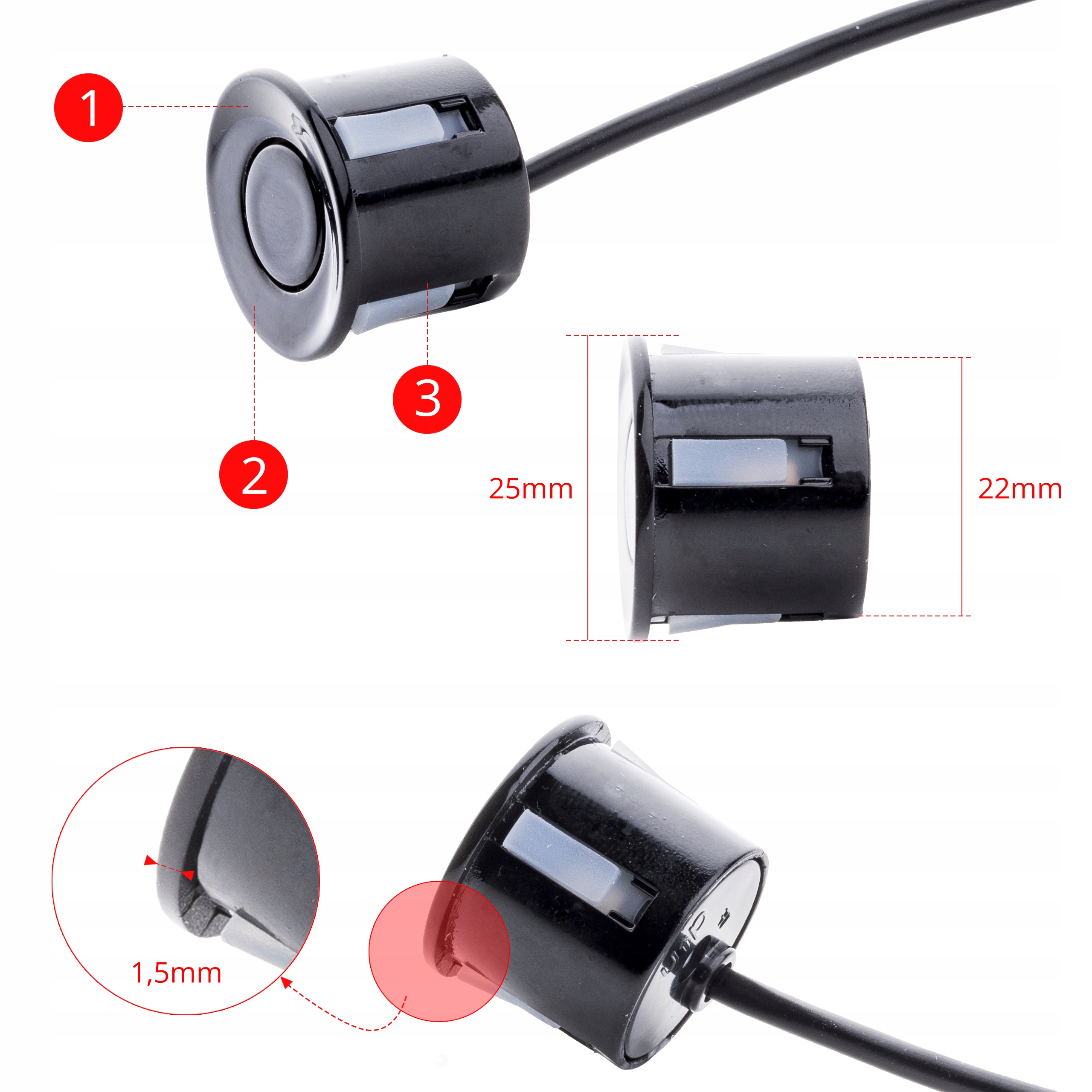 дополнительным преимуществом являются раскручиваемые датчики - это ускоряет и облегчает процесс установки комплекта в автомобиле. А в случае повреждения датчика (например, удара) нет необходимости снимать бампер-вынимаем датчик, откручиваем его и заменяем.
