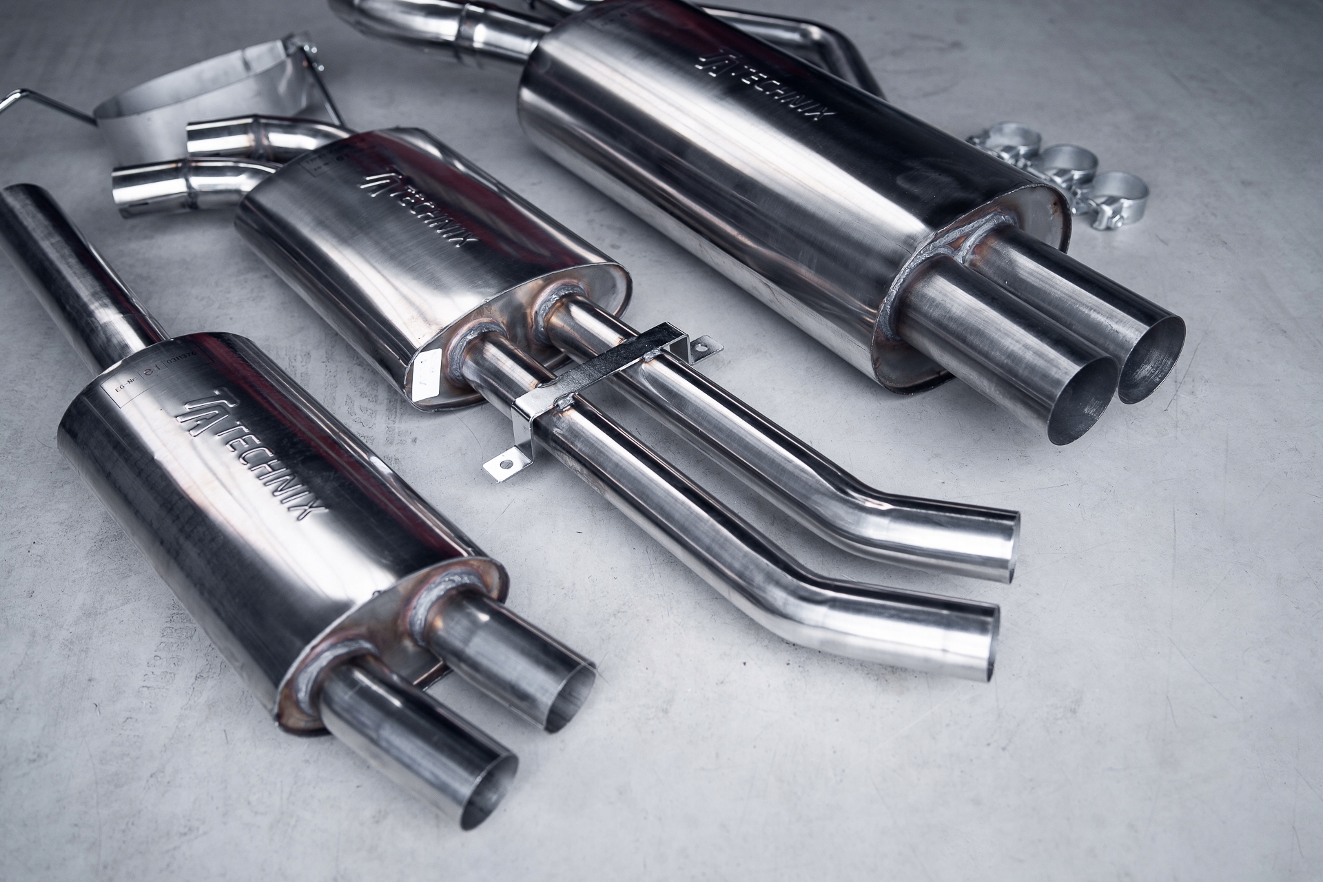 Система подключается к оригинальным выпускным коллекторам с первым прямоточным глушителем, затем еще одним прямоточным глушителем и последним камерным глушителем с двумя прямыми наконечниками диаметром 76 мм каждый. Все это, конечно, сделано из так называемого «кислоты».