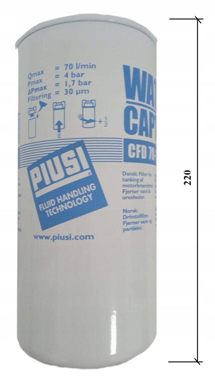 фильтр сепаратора воды PIUSI Water Captor предназначен для фильтрации таких продуктов, как дизельное топливо, отопительное масло и био. Конструкция водоотделителя PIUSI CFD 70-30 улавливает все твердые частицы размером более 30 мкм, удаляет воду из топлива, благодаря чему в дизельном топливе остаются все компоненты, которые их облагораживают. картриджные фильтры CFD 70-30 удерживают воду, не изменяя свойств самого масла. Фильтр - это водопоглощающий картридж. Этот тип фильтра характерно отделяет и поглощает воду, присутствующую в перекачиваемом дизельном топливе. Однако поглощение воды постепенно приводит к снижению фильтрующей способности и, следовательно, к увеличению потерь головки, вызванных фильтром. Эти фильтры гарантируют базовую защиту двигателей, использующих дизельное топливо.п>
