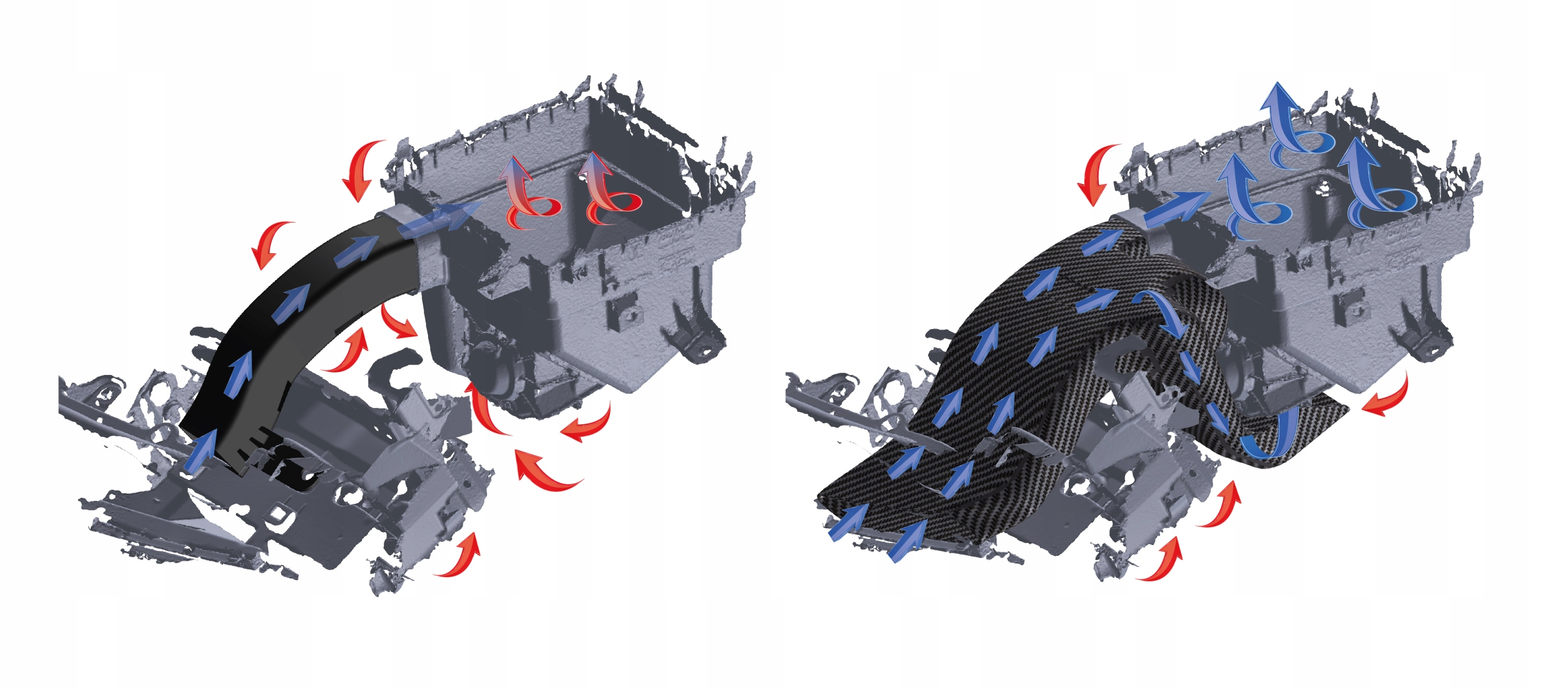 используя 3D-сканирование и САПР SolidWorks, команда разработчиков FORGE смогла оптимизировать размер впускного канала, увеличив непрерывную подачу холодного воздуха в заводскую воздушную коробку. 3D-печатные тестовые детали использовались вместе с симуляцией САПР для обеспечения оптимального размера и геометрии. Эта эффективная автомобильная часть впускного канала намного больше, чем серийная, и плотно прилегает к переднему бамперу и воздушной коробке, чтобы обеспечить минимальное воздействие тепла от двигателя.