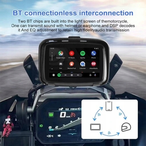 Навигация для мотоцикла с беспроводной системой Car Play и Android Auto Эта усовершенствованная навигация для мотоцикла сочетает в себе превосходную функциональность CarPlay и Android Auto, обеспечивая плавное соединение с вашим iPhone или смартфоном Android. Благодаря этому вы можете наслаждаться любимыми приложениями, такими как карты ( не имеет встроенных карт , это адаптер для Android Auto и CarPlay), музыку и новости, находясь за рулем. Водонепроницаемость гарантирует работу в различных погодных условиях. Быстрый процессор обеспечивает плавную работу, а установка на руль мотоцикла и возможность постоянного питания делают его идеальным решением для мотоциклистов, ценящих безопасность, комфорт и современные технологии во время поездок. Что такое CarPlay и Android Auto? Wireless CarPlay и Android Auto в системе навигации мотоцикла — это передовые технологии, обеспечивающие беспроводное подключение к мобильному устройству. Это инновационное решение позволяет мотоциклистам использовать функции навигации, связи и развлечений через навигационный интерфейс, используя привычные по телефону приложения, такие как карты, музыка и новости.