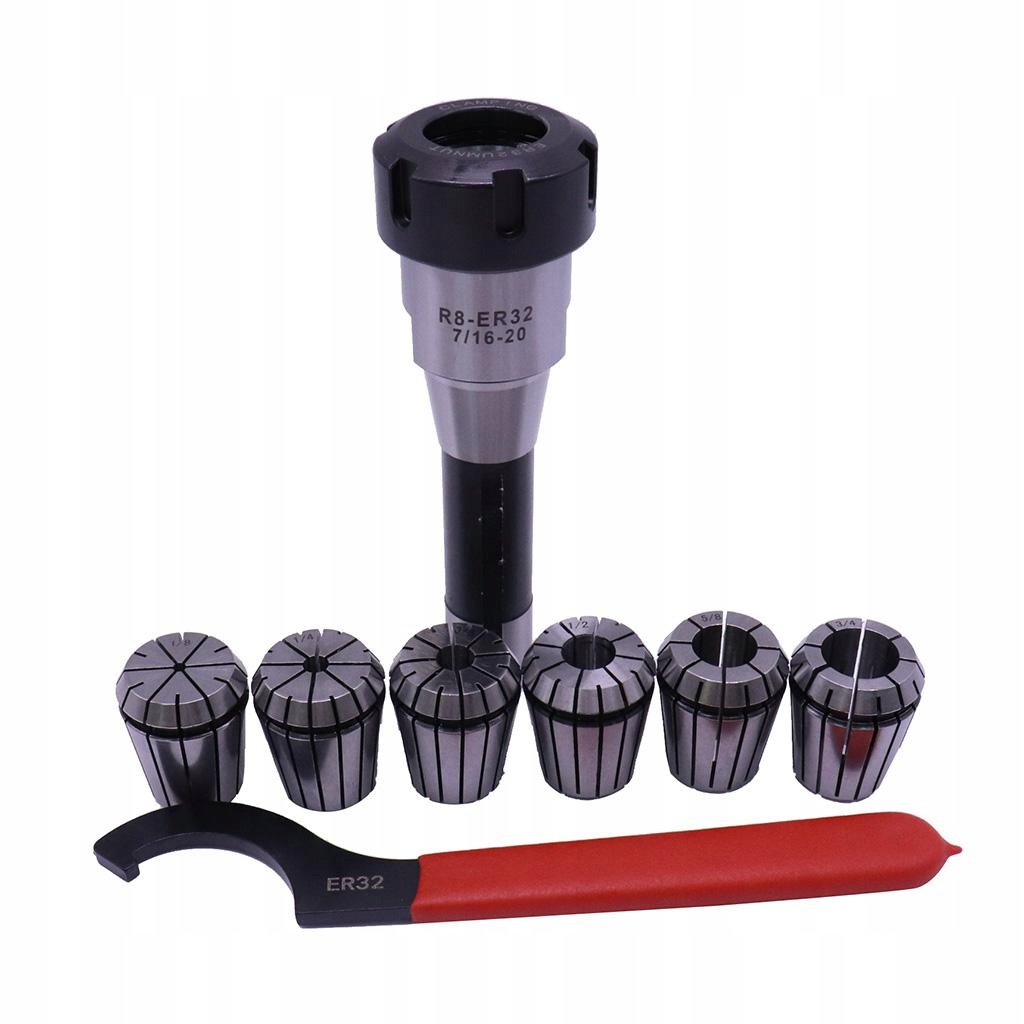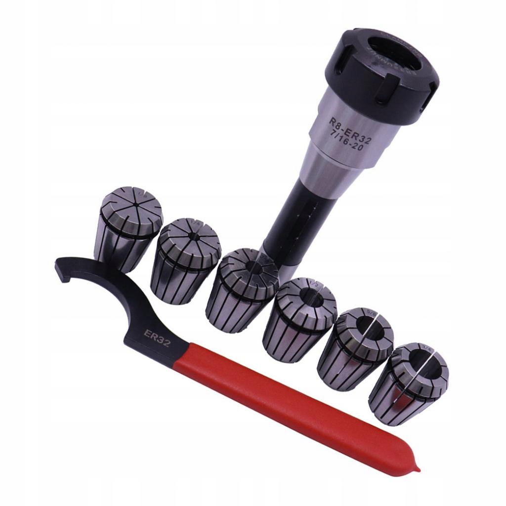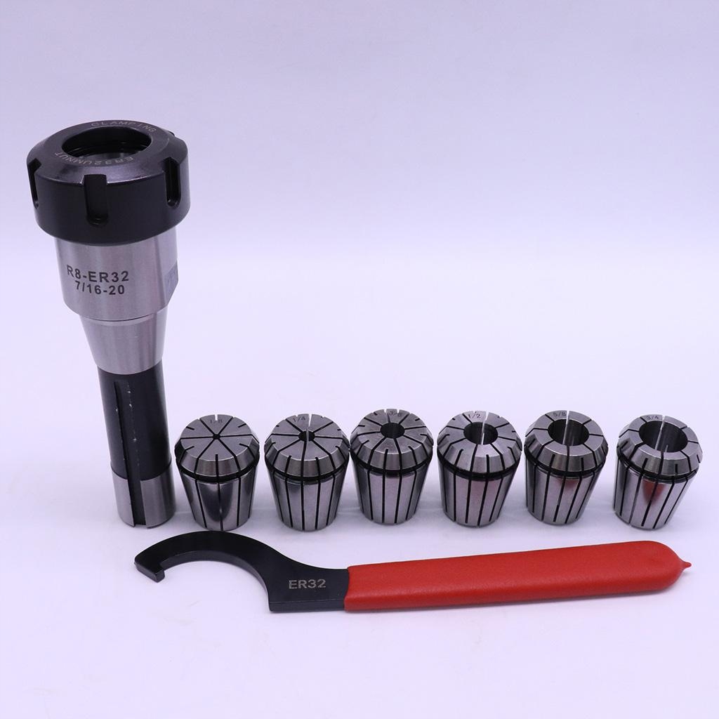 упаковка включает: 1 шт. R8 хвостовик ER32 цанговый патрон. 6 шт. Набор пружинных втулок ER32, 1 шт. Гаечный ключ ER32