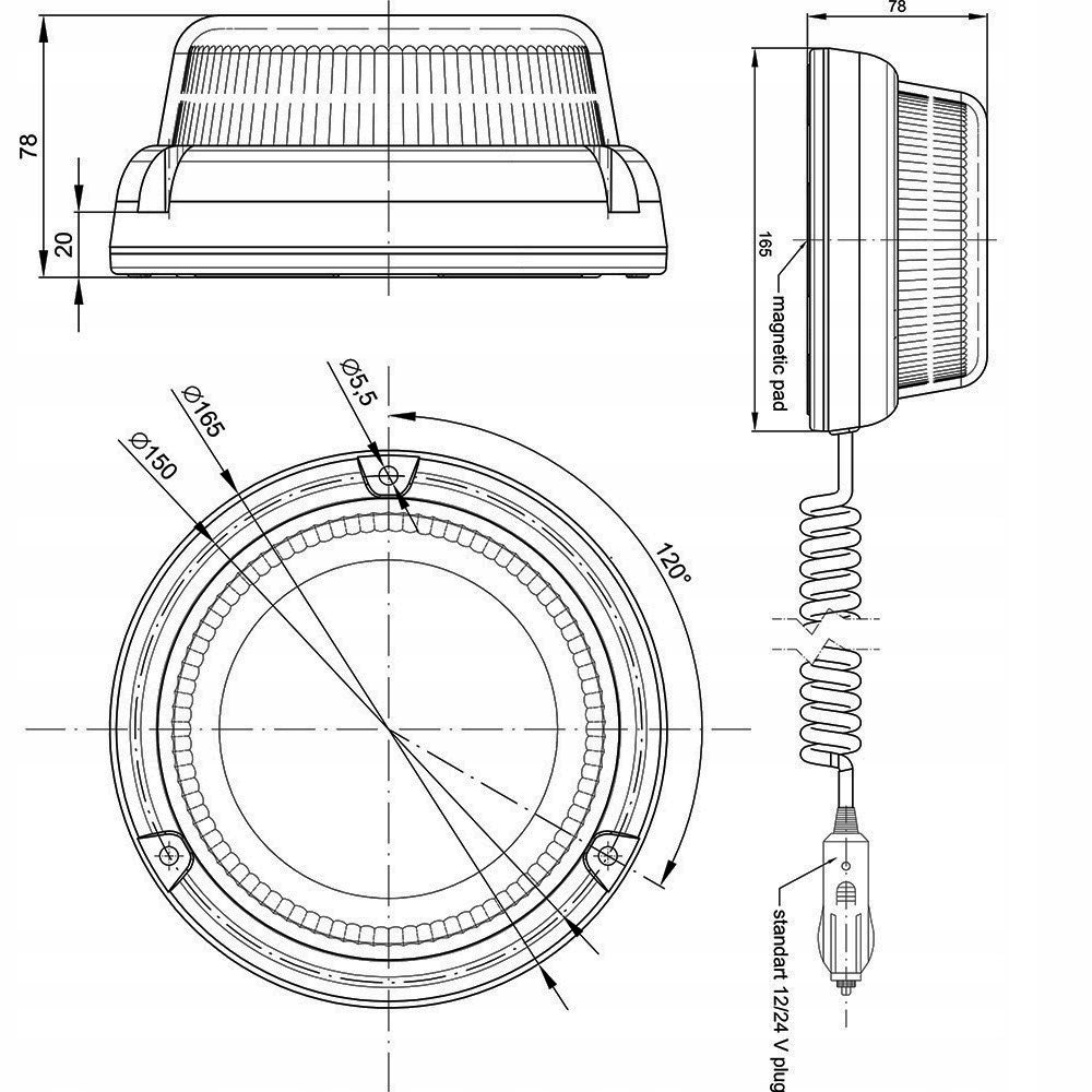 крепится на магнитной прокладке. Лампа оснащена спиральным кабелем длиной в 3 м (по спирали 0,6 м), заканчивающимся стандартной вилкой прикуривателя 12/24 В. p>