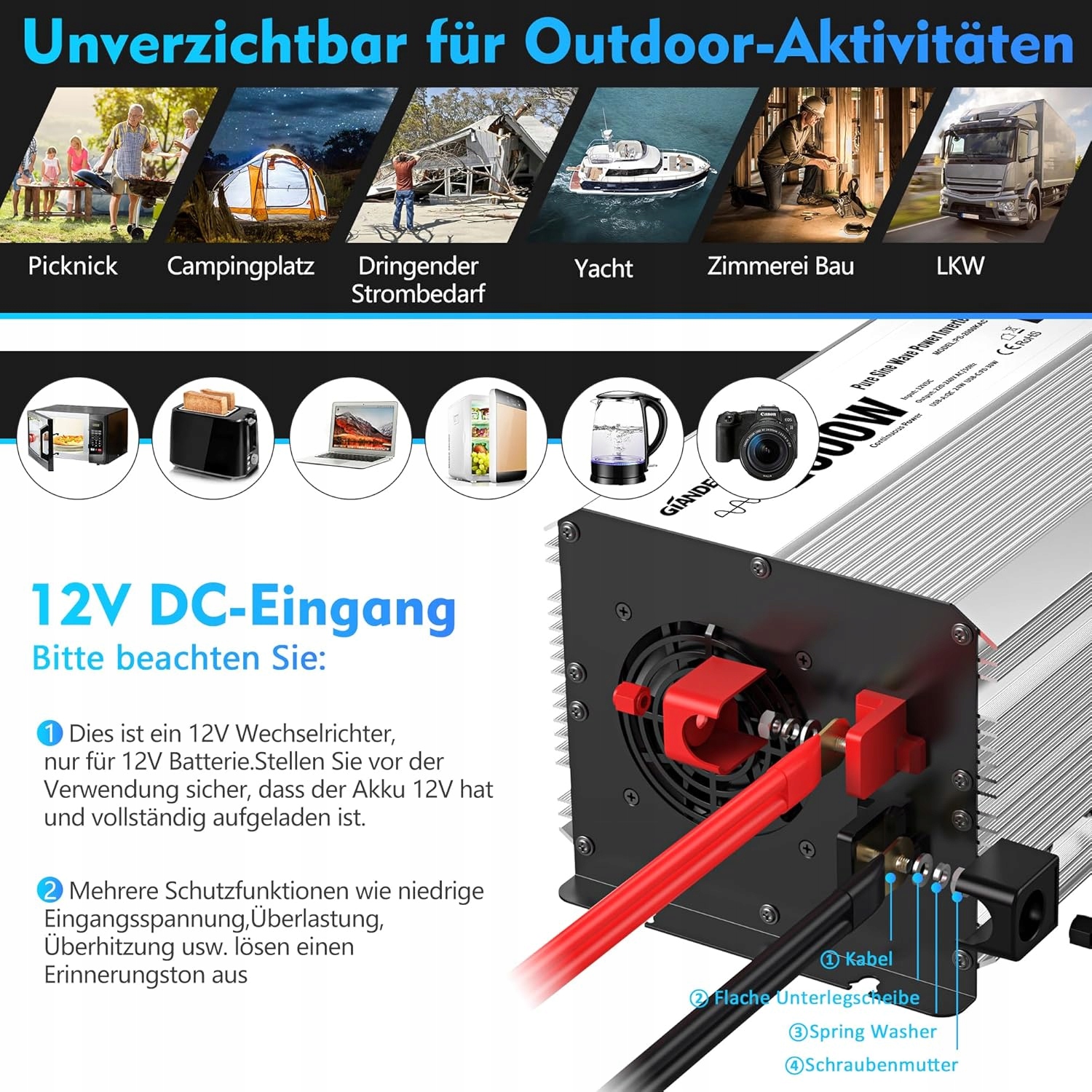 【Прочный и долговечный】В отличие от пластиковых корпусов других марок, инверторы GIANDEL изготовлены из высококачественного алюминиевого корпуса, который обеспечивает расширенную защиту от падений и ударов, а также быстрый и эффективный отвод тепла, а также продлевает срок службы. Срок службы инвертора.
