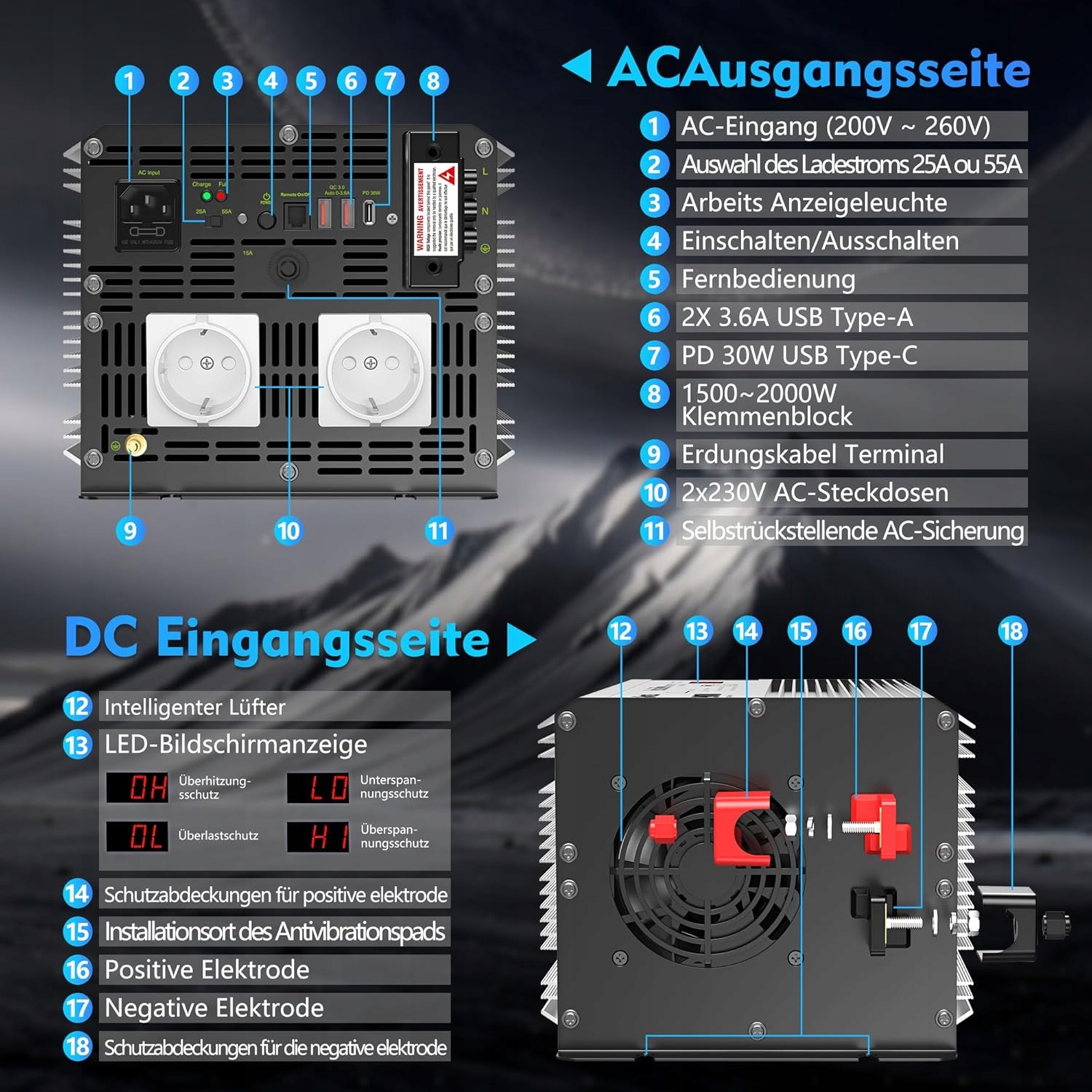 Инвертор чистой синусоидальной волны мощностью 2000 Вт с несколькими портами USB — обеспечивает непрерывную мощность 2000 Вт от 12 В до 230 В постоянного тока. Также имеется 2 выходные розетки переменного тока, 2 порта USB типа A (5 В/3,6 А) и 1 порт USB-C. порт (PD 30 Вт), который поддерживает выход быстрой зарядки мобильного телефона.