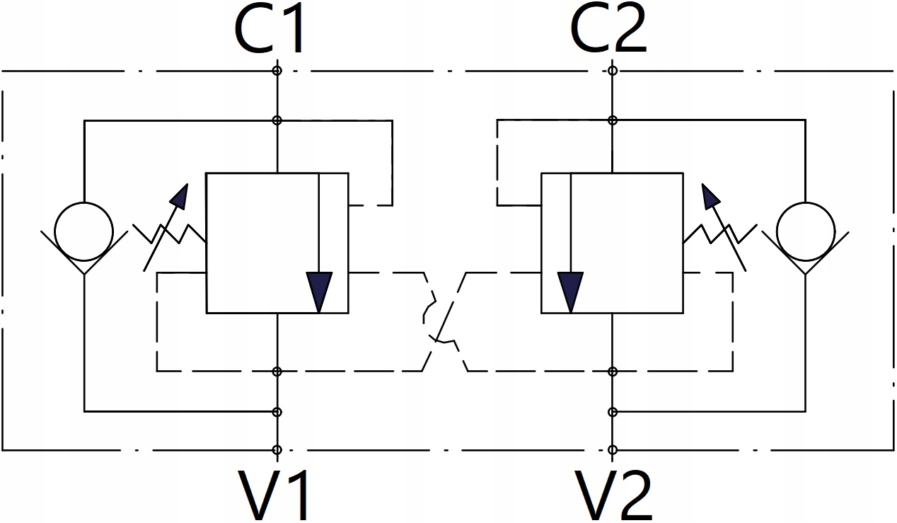 поток отV1 до C1 и от V2 до C2 полностью блокируется , когда на V1 и V2 не работает давление, тогда как разблокируется, когда на V1 или V2 влияет давление.