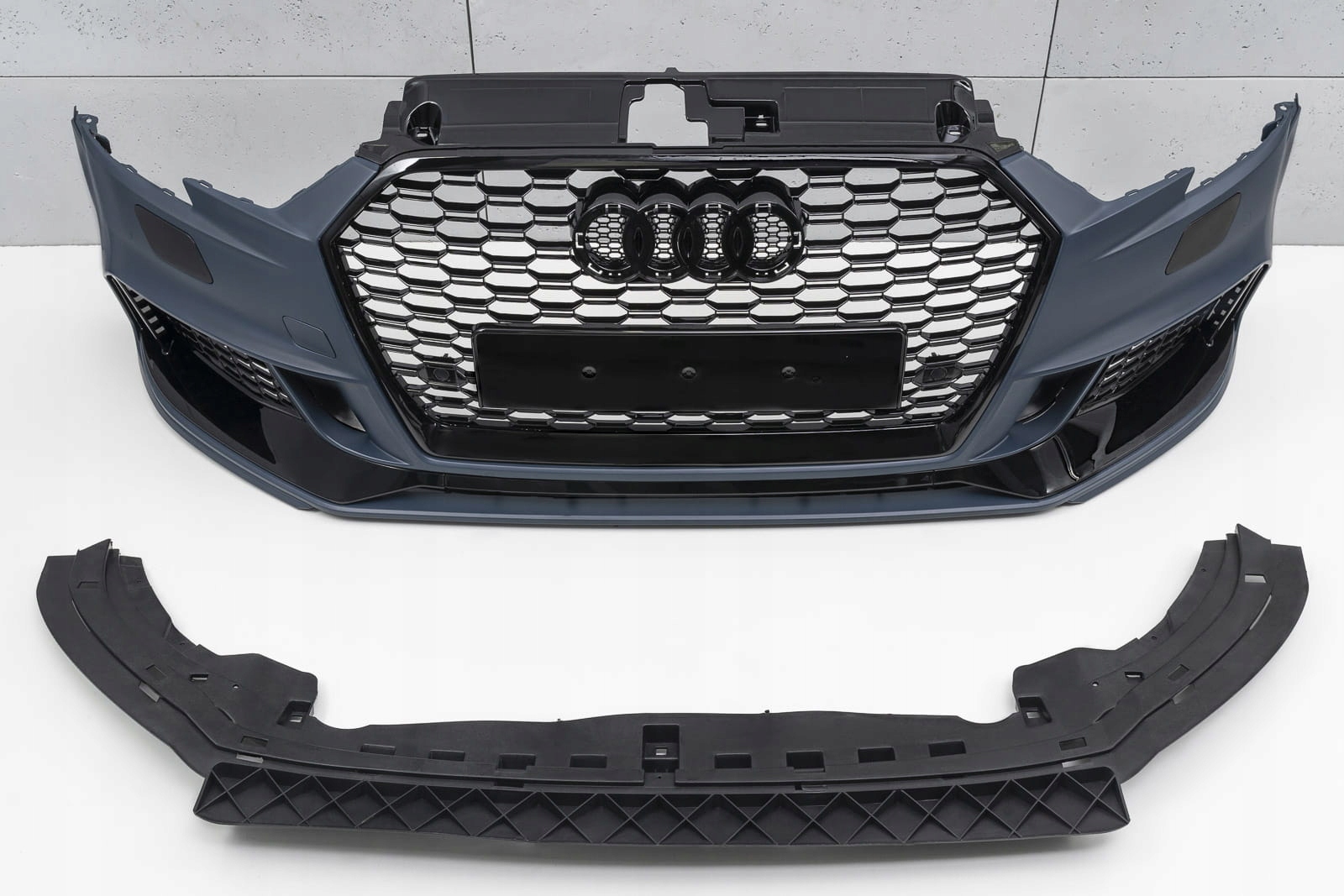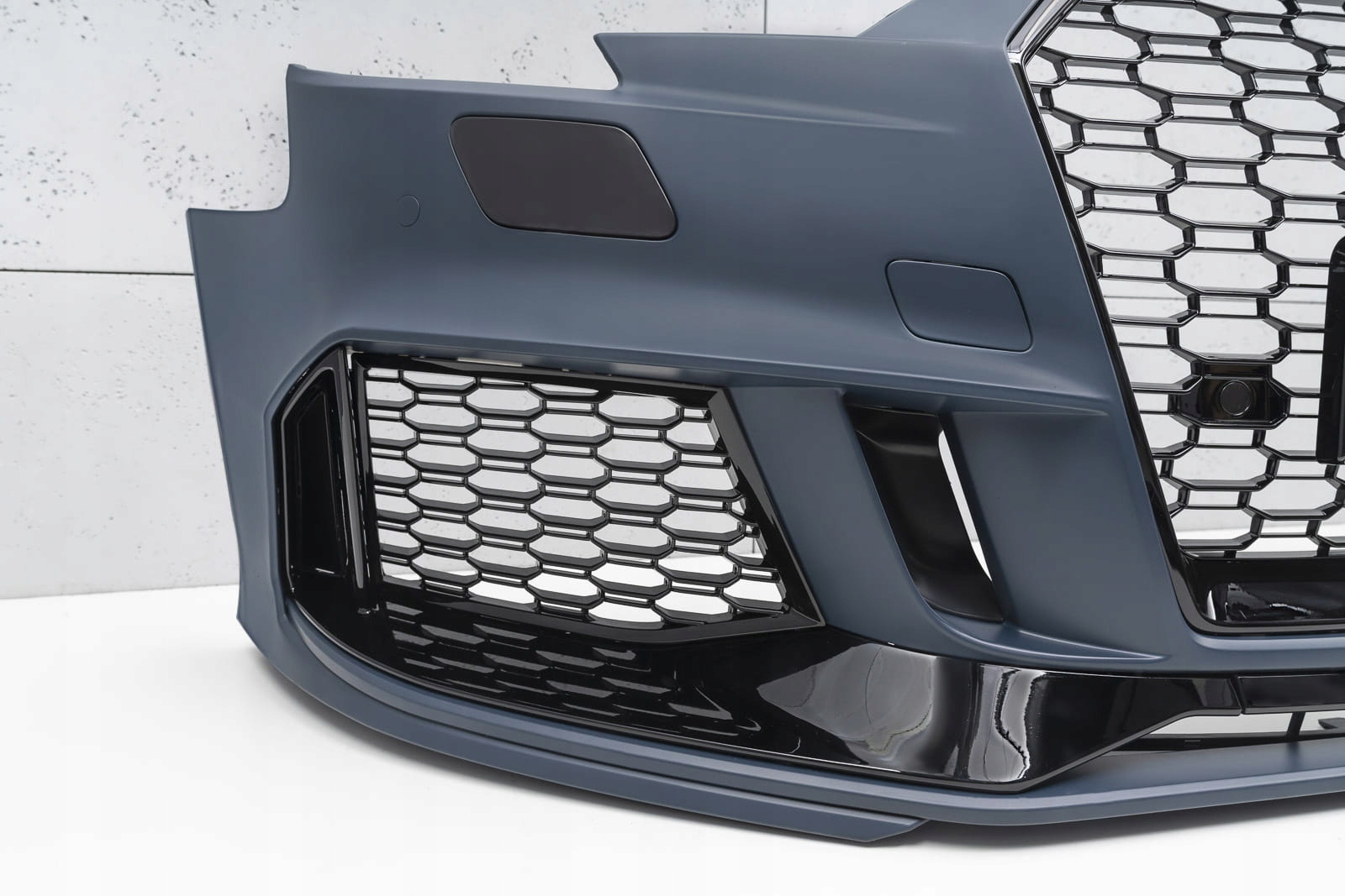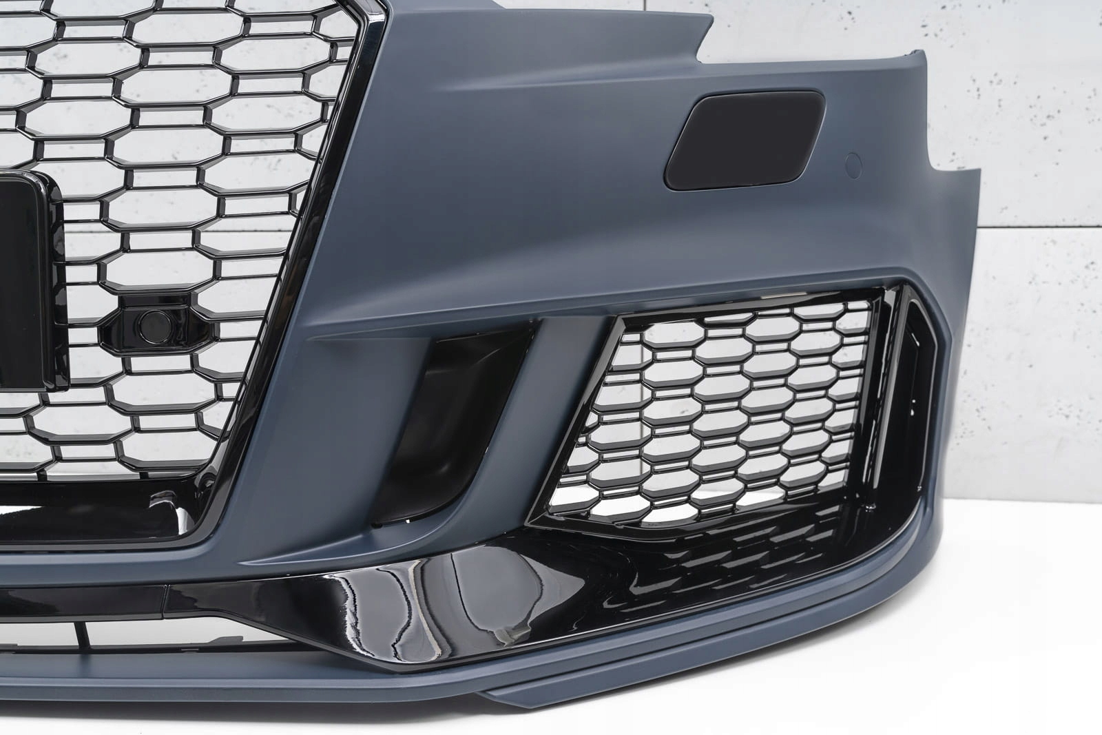 - передняя решетка - решетка радиатора с сотовым рисунком является отличительной чертой моделей RS, что обязательно напоминает внушающие страх, мощные спортивные автомобили высшего класса. Элемент впечатляет своим спортивным характером, а блеск черных лакированных элементов придает ему элегантность, благодаря чему он идеально сочетается с впечатляющим дизайном AUDI A3. По обе стороны от номерного знака есть места под датчиками парковки PDC. в комплект входит съемный корпус передней камеры.