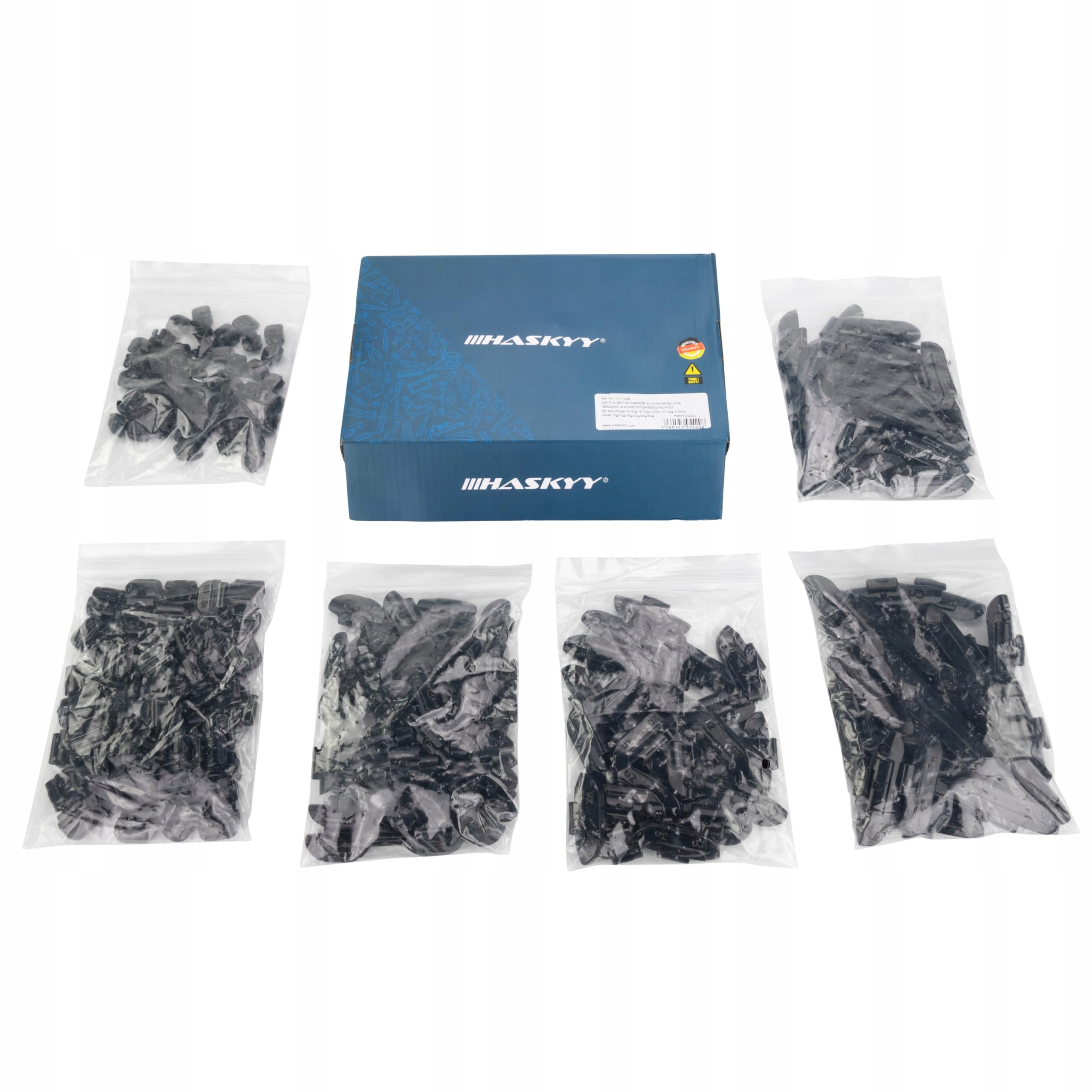 Описание продукта : Черные стальные диски HASKYY, 225 предметов, вес 5–30 г (5–15 г на 50 шт. ~ 20–30 г на 25 шт.) с 1 ассортиментной коробкой. Комплект черных стальных дисков HASKYY, состоящий из 225 предметов, представляет собой высококачественный и универсальный инструмент для профессиональной балансировки автомобильных шин. Грузики точно изготовлены и обеспечивают точный баланс, чтобы избежать вибрации и неравномерного износа шин. В комплект входит большой выбор грузов для широкого спектра размеров и типов шин. Черное покрытие грузиков со стальным ободом не только придает им привлекательный внешний вид, но и защищает от коррозии и износа. Благодаря этому гири остаются прочными и надежными даже при частом использовании. С помощью набора грузиков для стальных дисков HASKYY, состоящего из 225 деталей, вы сможете быстро и эффективно восстановить баланс автомобильных шин, чтобы обеспечить безопасное и комфортное вождение. Будь то профессиональное использование в мастерской или любитель DIY, этот набор предлагает все необходимое для точной балансировки. Объем поставки: 5 грамм – 50 штук 10 г – 50 штук. 15 г – 50 шт. 20 г – 25 шт. 25 г – 25 шт. 30 г – 25 шт. 1 х Ассортиментная коробка.