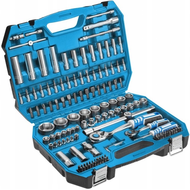 полный набор из 108 элементов, состоящий из трещоток, насадок, отверток и других аксессуаров 1/2” и 1/4”.