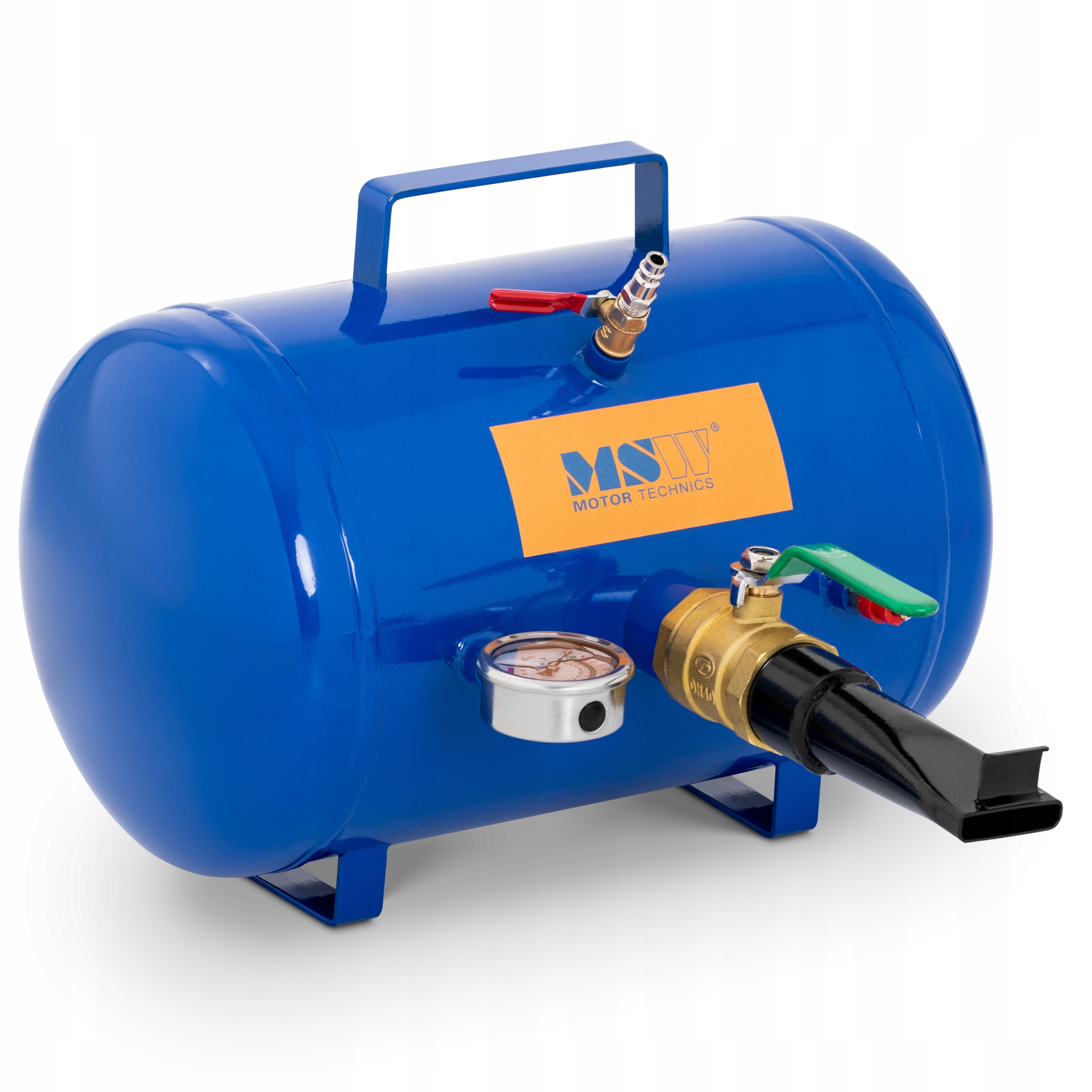 высокая производительность обусловлена рабочим давлением 8 бар и максимальной емкостью. 19,5 л. Бак для прокачки колес имеет максимальное давление наполнения 10 бар. Имеет манометр и предохранительный клапан.