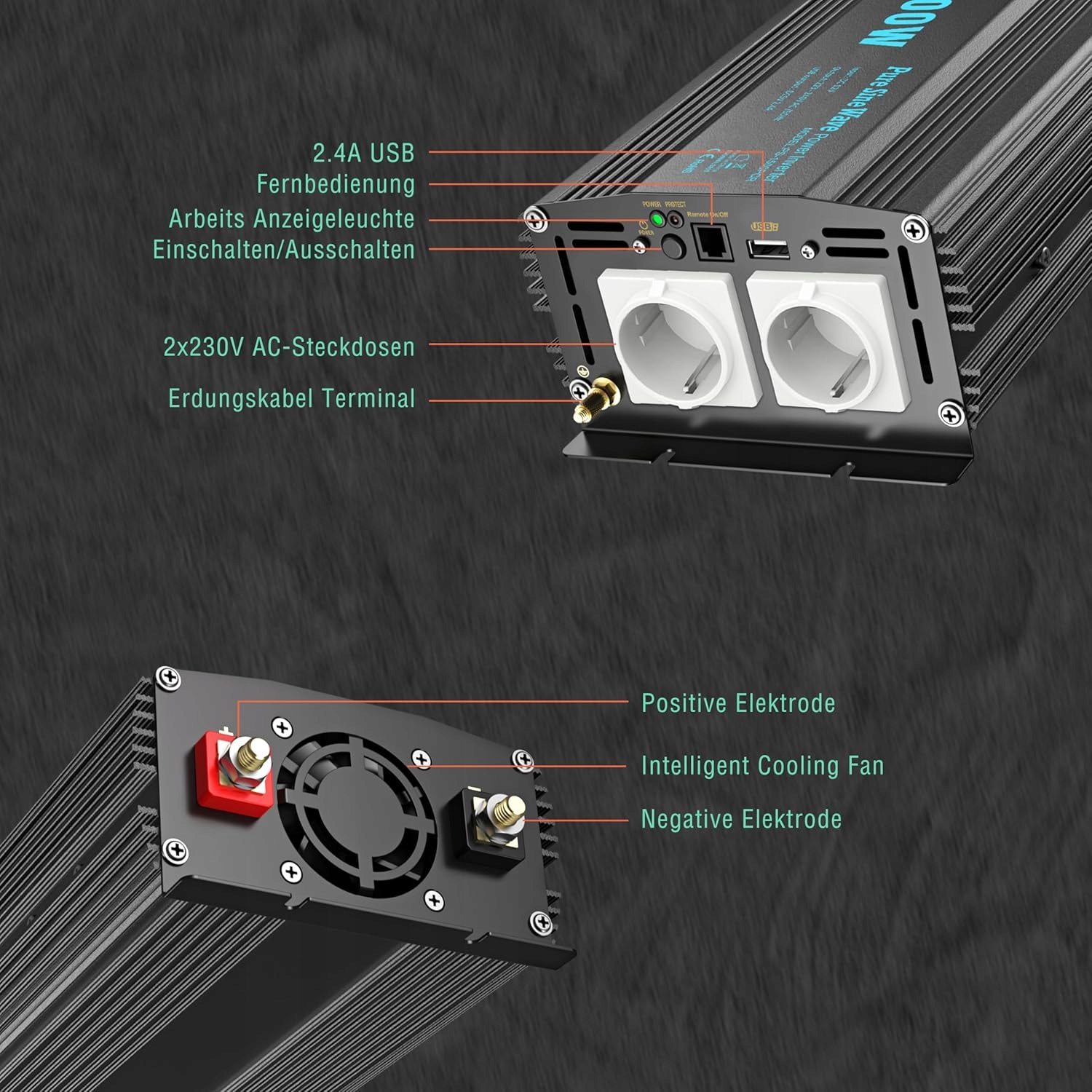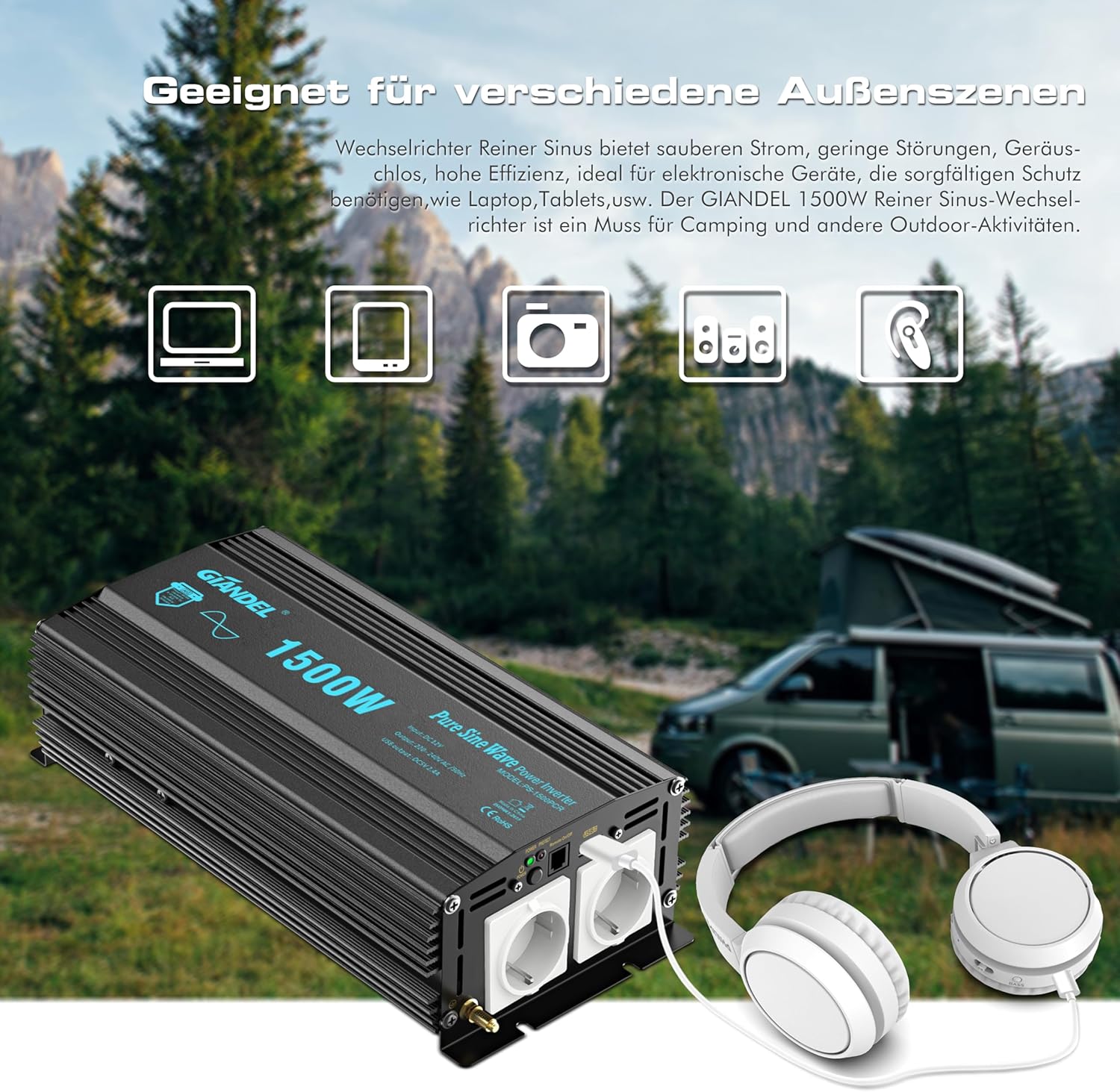 Синусоидальный инвертор мощностью 1500 Вт: Синусоидальный инвертор имеет превосходное качество выходного сигнала и более стабилен. Он был специально разработан для устройств, которые необходимо тщательно защищать. Он обеспечивает непрерывную мощность 1500 Вт от 12 В постоянного тока до 230 В переменного тока и имеет 2 розетки переменного тока и один порт USB на 2,4 А.