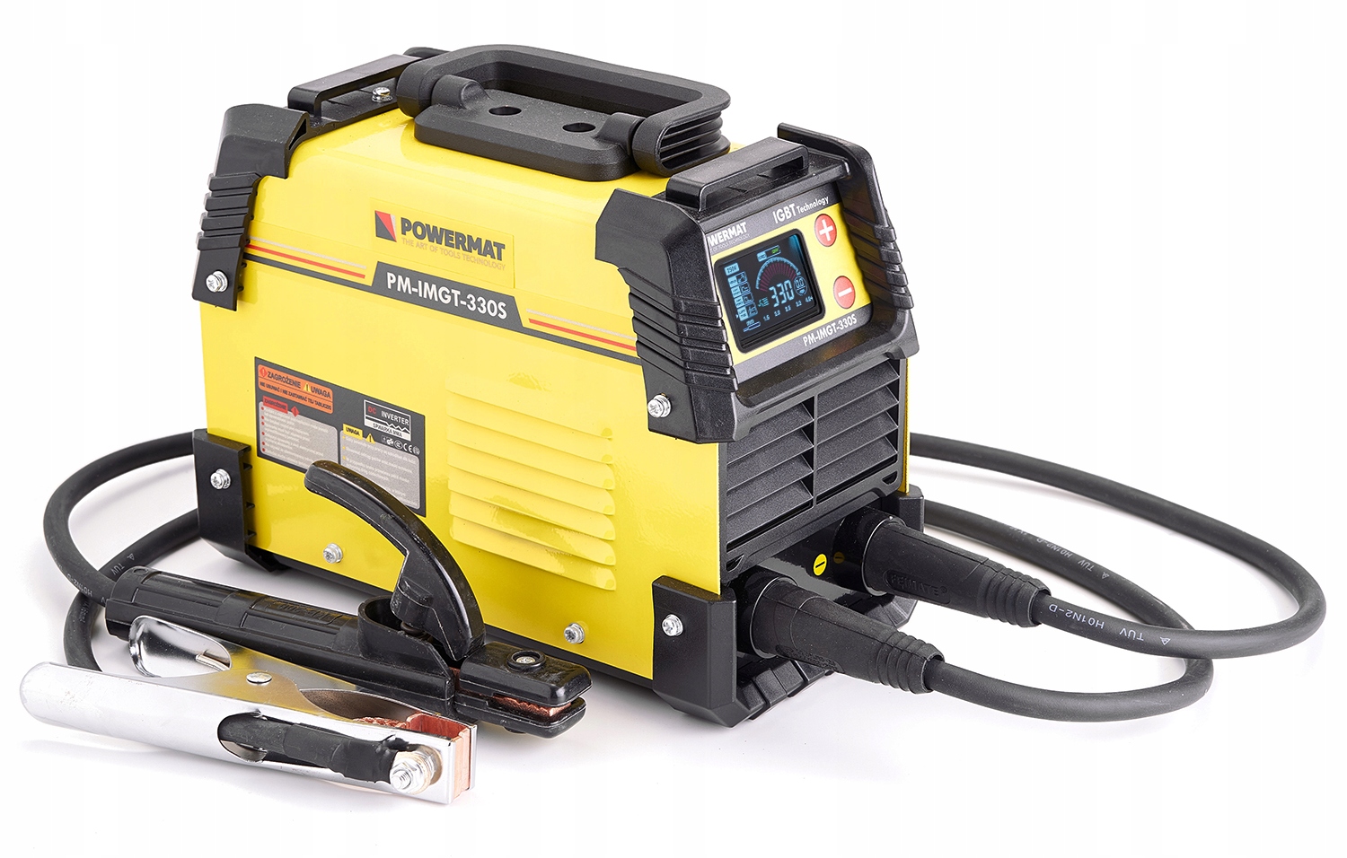 модель PM-IMGT-330S-это инверторный сварочный аппарат, конструкция которого основана на эффективных транзисторах IGBT. Он оснащен ЖК-дисплеем, указывающим ток сварочного тока, который устанавливается ручкой с плавной регулировкой.
