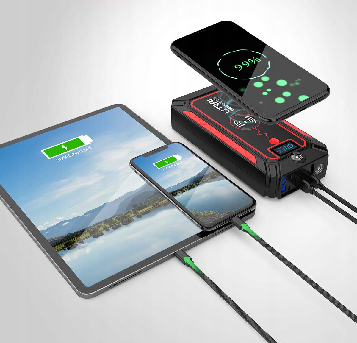 Utrai Booster Pack Jump Starter также является портативным внешним аккумулятором, может достигать быстрой беспроводной зарядки 10 Вт, добавлены двойные выходы USB (USB QC3.0: 5 в/3 а, 9 в/2 а, 12 в/1,5 А и USB: 5 в/2,1 а). Скорость зарядки на 80% выше, чем у обычного мобильного блока питания.п>