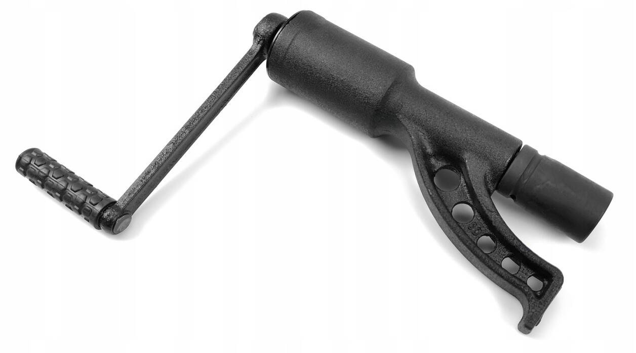 после ослабления планетарным гаечным ключом штифтов в колесе и подъема автомобиля домкратом достаточно соединить кривошип с включенным в комплект удлинителем и крышкой, а затем можно приступить к более быстрому выкручиванию ослабленных гаек/болтов - таким образом, мы получаем конфигурацию с передаточным числом 1:1