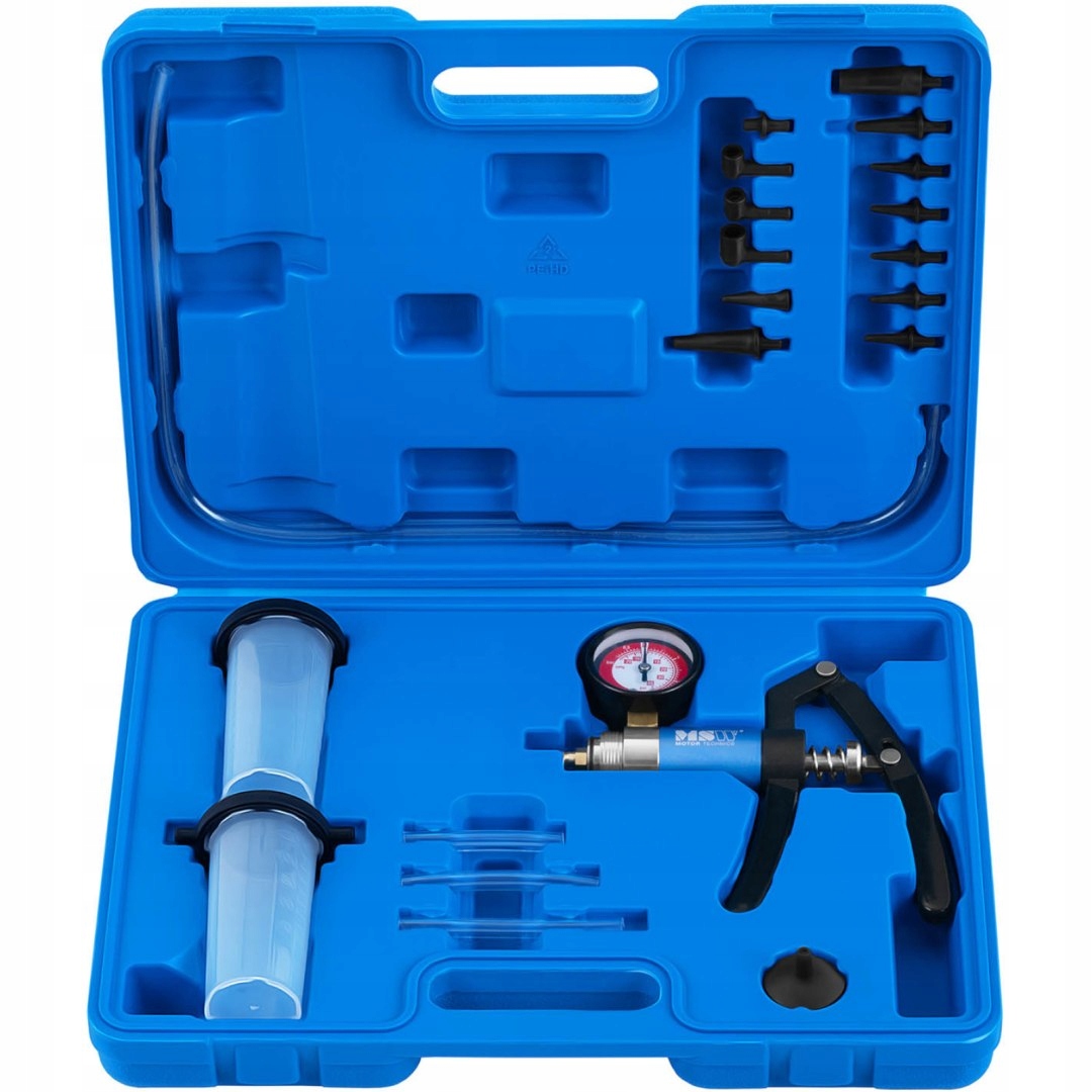 комплект для прокачки тормозов марки MSW < /B > будет использоваться в мастерских, автосервисах или в гараже любителя. Подходит для большинства марок и моделей автомобилей. Он позволяет прокачивать и заменять тормозную жидкость, а также используется для проверки герметичности пневматических, гидравлических клапанов, клапанов контроля давления впускного воздуха, клапанов усилителя тормозов, трансмиссий или карбюраторов. Практичный чемодан обеспечивает удобную транспортировку и хранение .