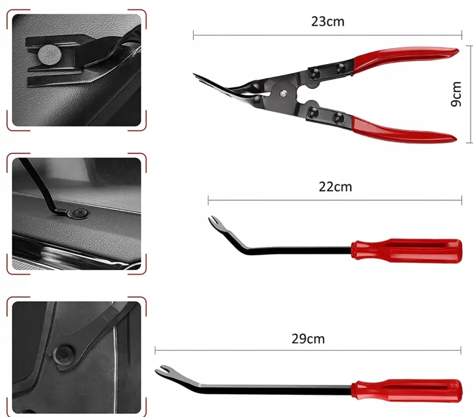 В КОМПЛЕКТЕ МНОГО ЭЛЕМЕНТОВ - в комплект съемников для обивки входит много элементов - помимо 12 съемников для обивки, в комплект входят также кусачки, 2 зажима для клипс (22,5 и 31 см) и 8 съемников для радио, 11 штыревых ключей, чехол на молнии и 4 крючка для снятия пломб.