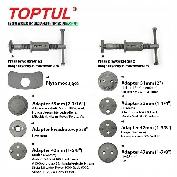 Набор TOPTUL JGAI1801 — идеальное решение для механиков и людей, обслуживающих тормозные системы. Он позволяет быстро, эффективно и безопасно втягивать тормозные поршни в различных автомобилях, что делает его незаменимым инструментом в каждой мастерской.
