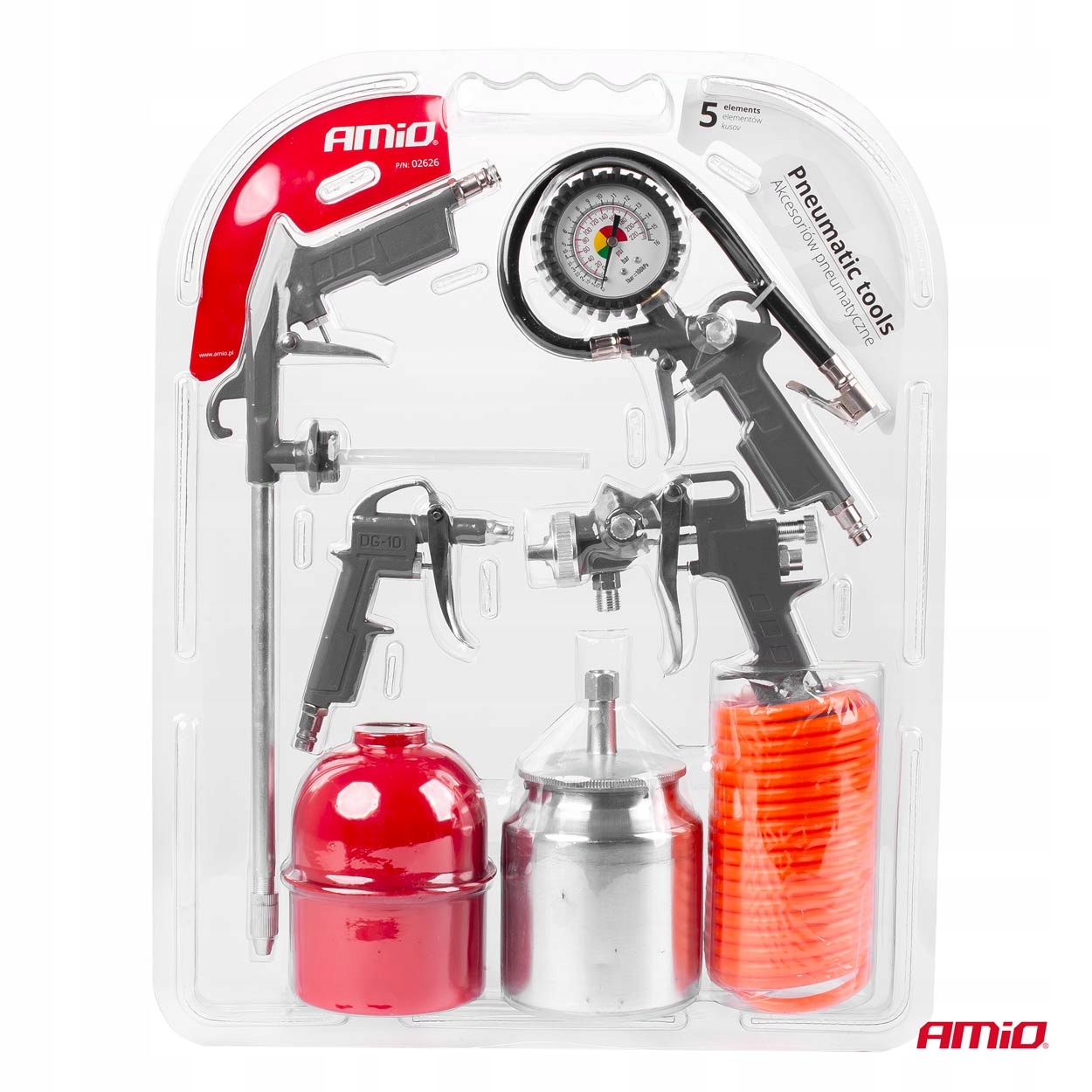 Набор для рисования состоит из 5 элементов. В комплект входят: покрасочный пистолет с верхним бачком, смазочный пистолет, пистолет для продувки, пистолет для подкачки шин с манометром и спиральный напорный шланг длиной 5 м. Набор предлагает широкий спектр применения в мастерской, например, покраску, прокачку или очистку поверхностей.