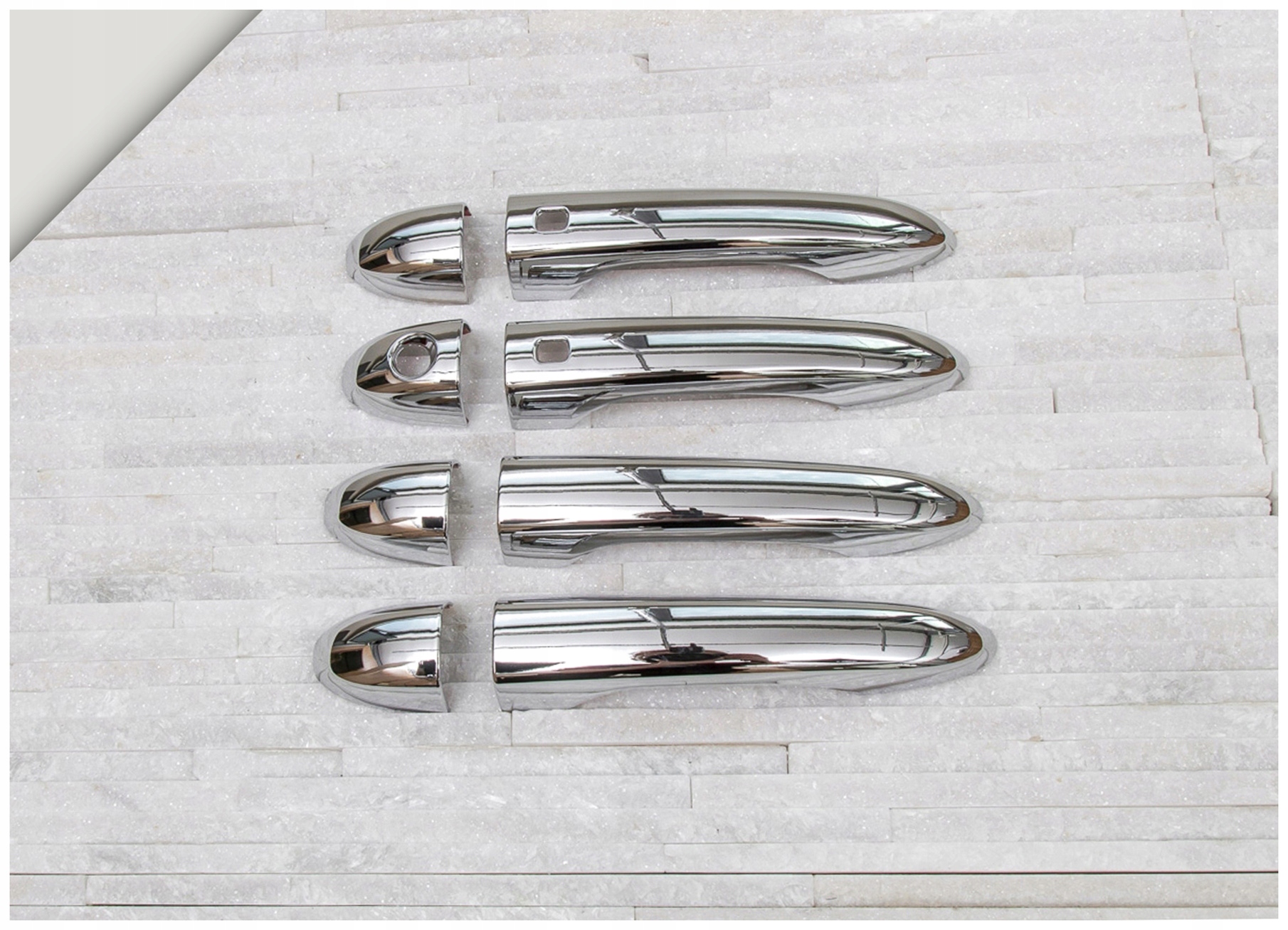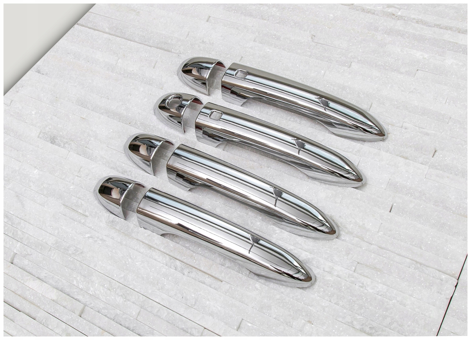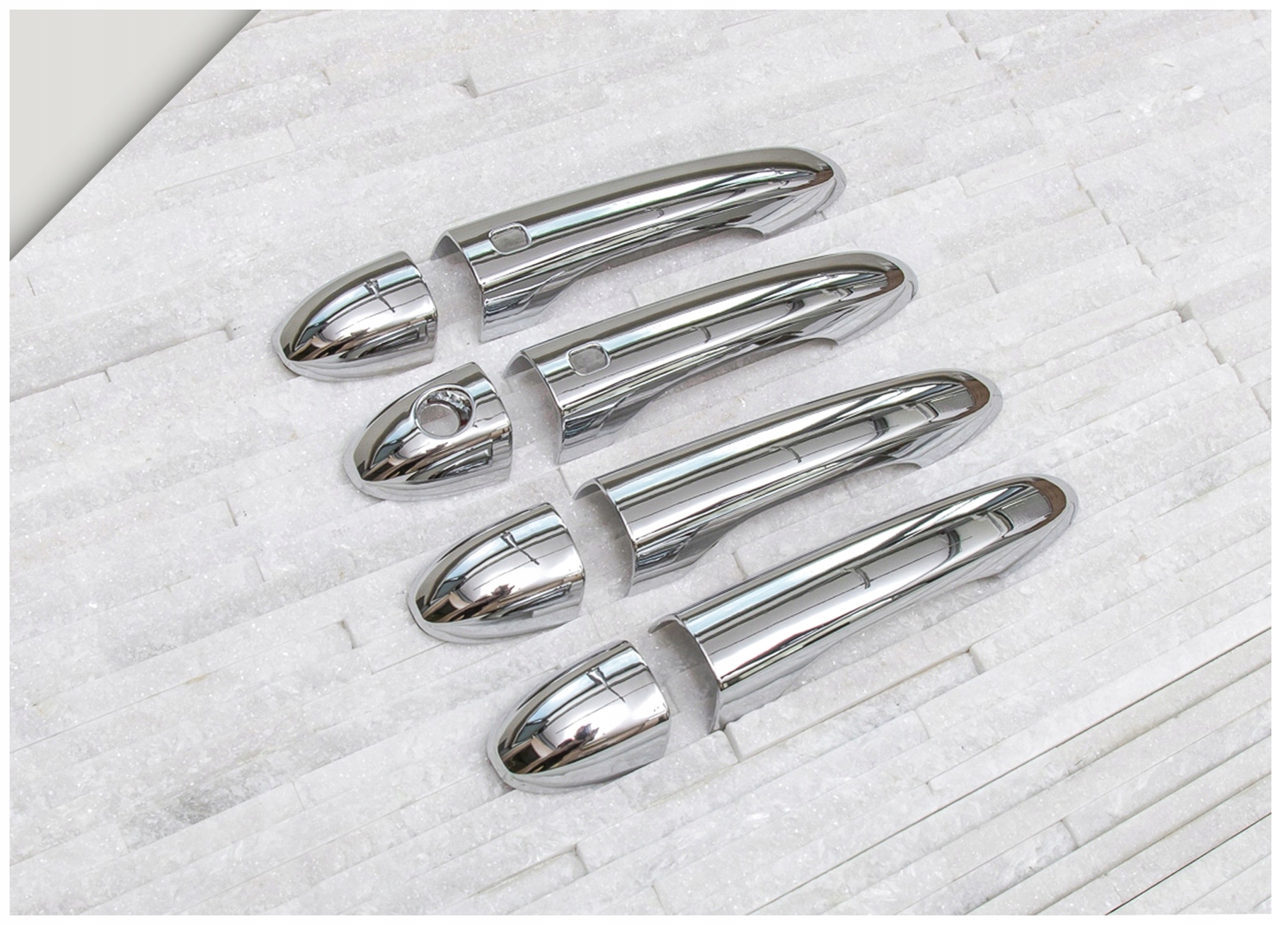Хромированные накладки на дверные ручки тонко подчеркивают линии кузова вашего автомобиля, подчеркивая элегантный и изысканный стиль. Эти элементы изготовлены из высококачественного хромированного АБС-пластика. Легкая и безопасная установка, вы можете сделать это самостоятельно. Накладки крепятся с помощью двустороннего скотча Scotch 3M, нанесенного с внутренней стороны. Их следует наносить на обезжиренную поверхность с помощью уайт-спирита или спирта, при температуре выше 18 градусов Цельсия. В комплект входит набор из четырех накладок на дверные ручки.