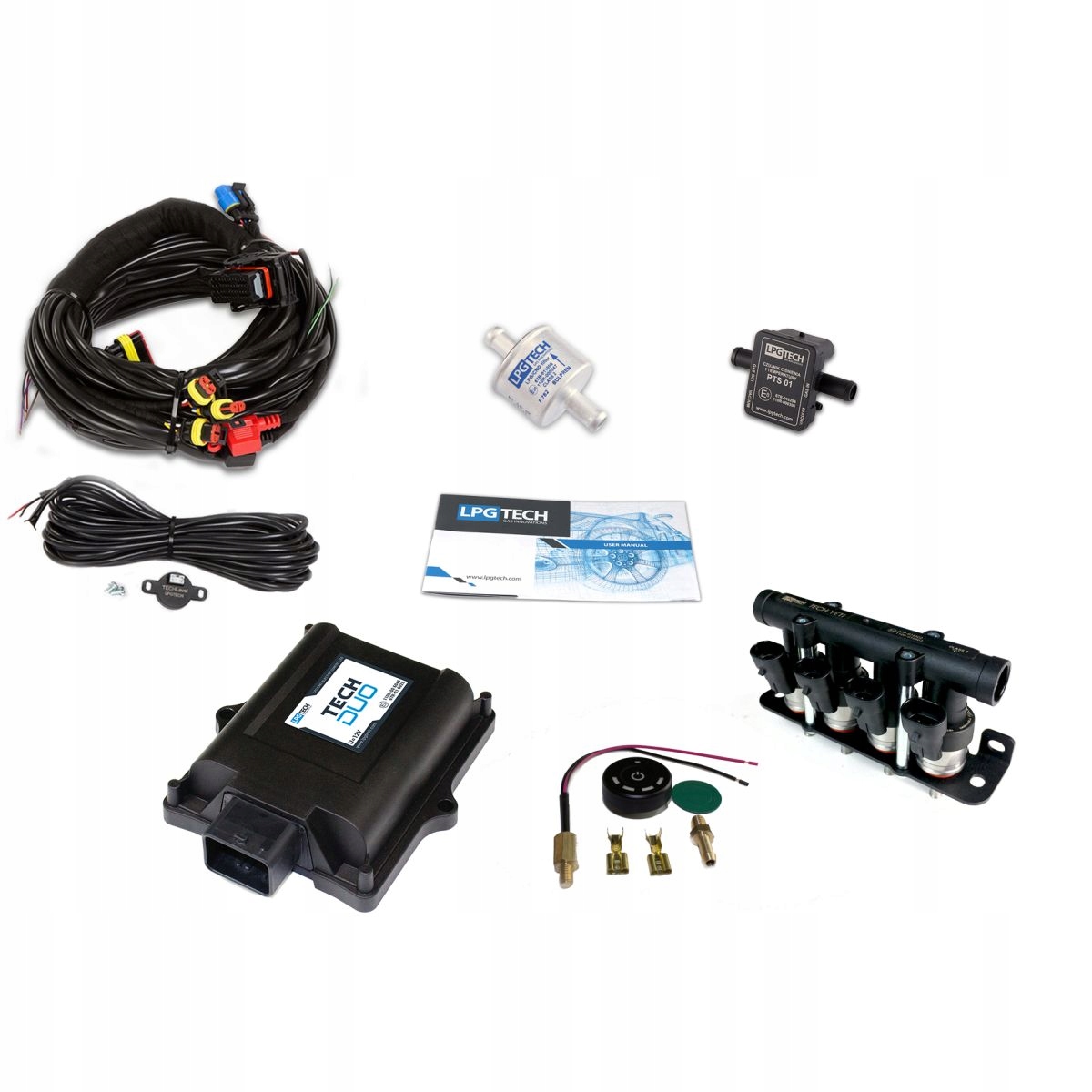 мини-комплект без редуктора LPGTECH, количество цилиндров 4, контроллер TECH DUO, инжекторы TECH-YETI, количество планок 1, Совместимость: Android 4.1 или выше, Windows XP или выше
