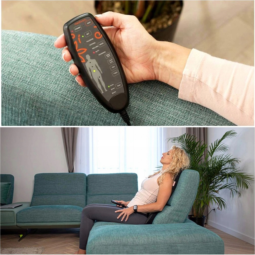 к устройству прилагается удобный пульт дистанционного управления , с помощью которого : вы включаете и выключаете коврик , устанавливаете время массажа ( 15 , 30или60 минут ) , зону массажа ( грудно-шейная , пояснично-крестцовая , вся спинаилиягодиц и бедер ) и его интенсивность ( >слабый , среднийилисильный )