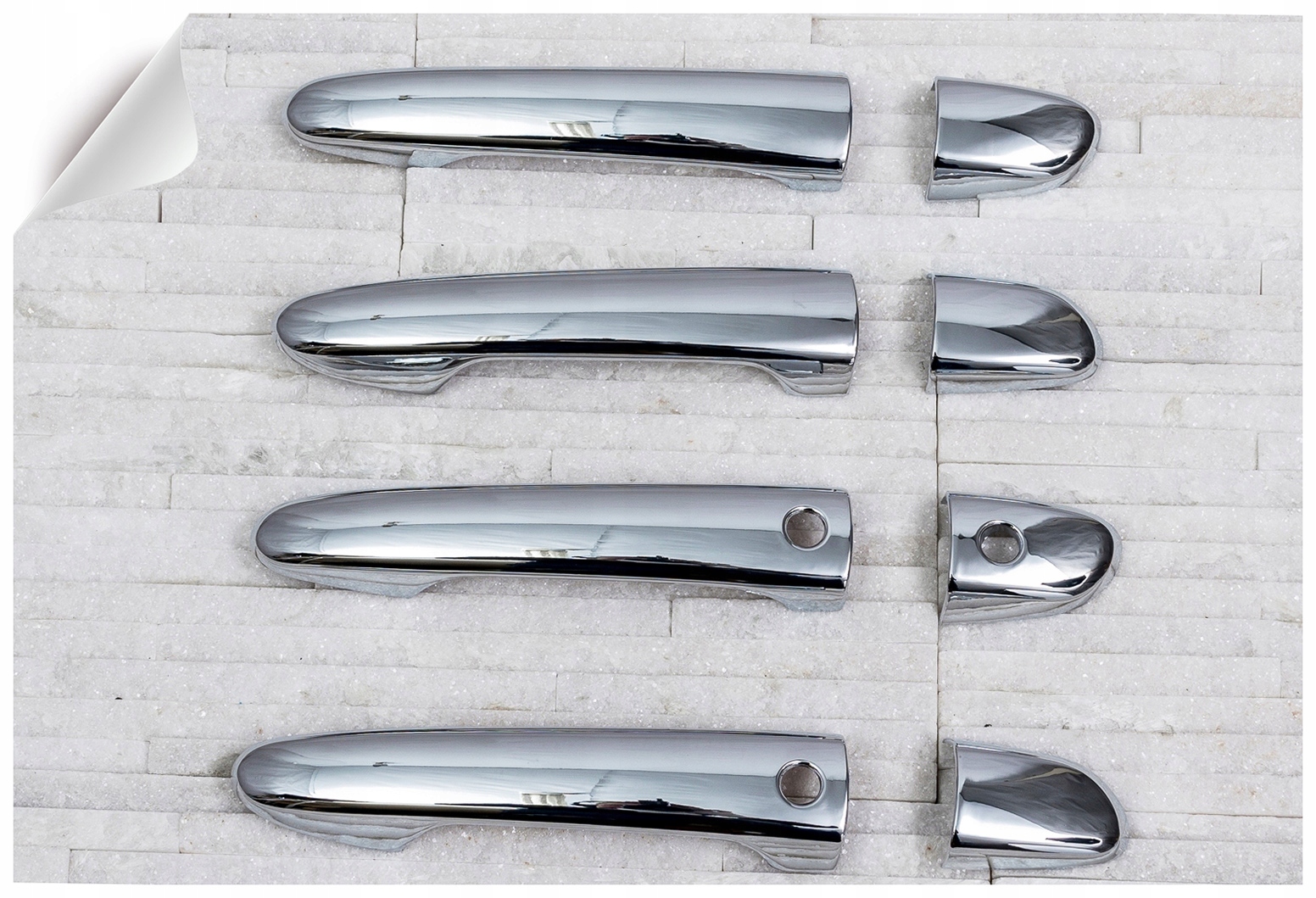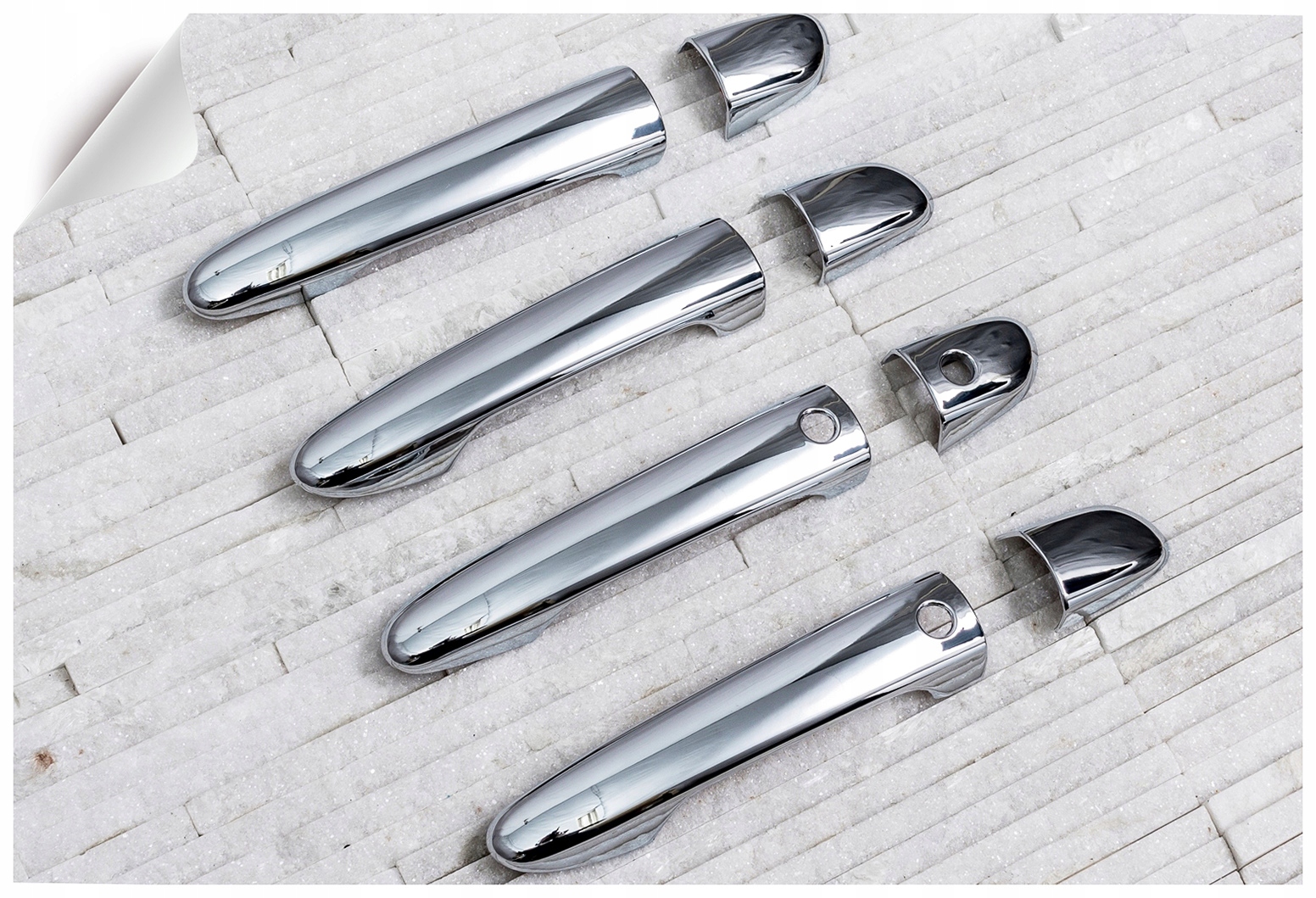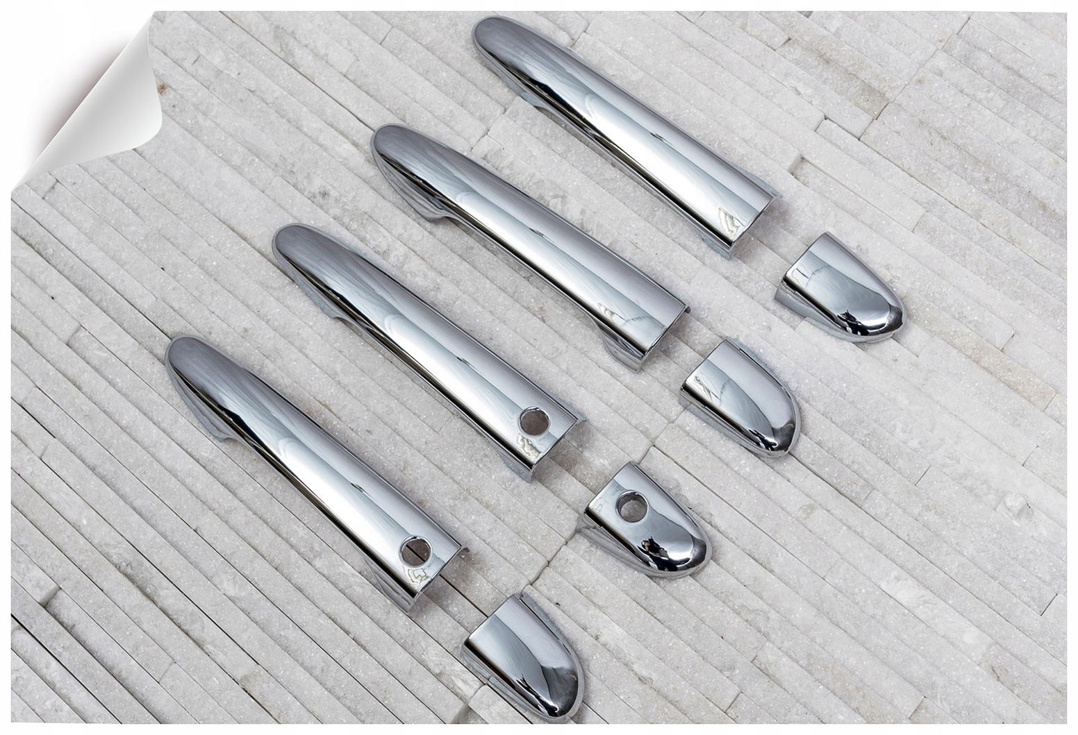 в комплект входит набор из четырех накладок на дверные ручки. Они монтируются с помощью скотча 3М двухсторонней клейкой ленты, прикрепленной к внутренней стороне элементов. Их наносят на обезжиренную поверхность при помощи экстрактивного бензина или спирта, при положительных температурах от 18 ° С. Рекомендуется профессиональная установка. п>
