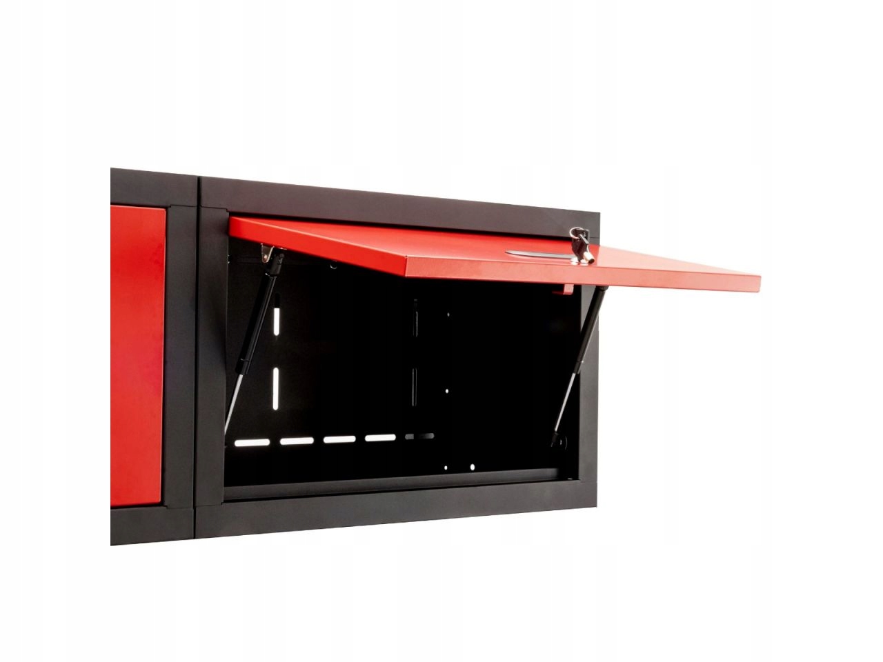 все это дополняется четырьмя маленькими шкафчиками наверху размером 40 x 65 x 27 см.эти шкафы оснащены пневматическими цилиндрами и удобной ручкой для открытия. Шкафы закреплены замком.п>