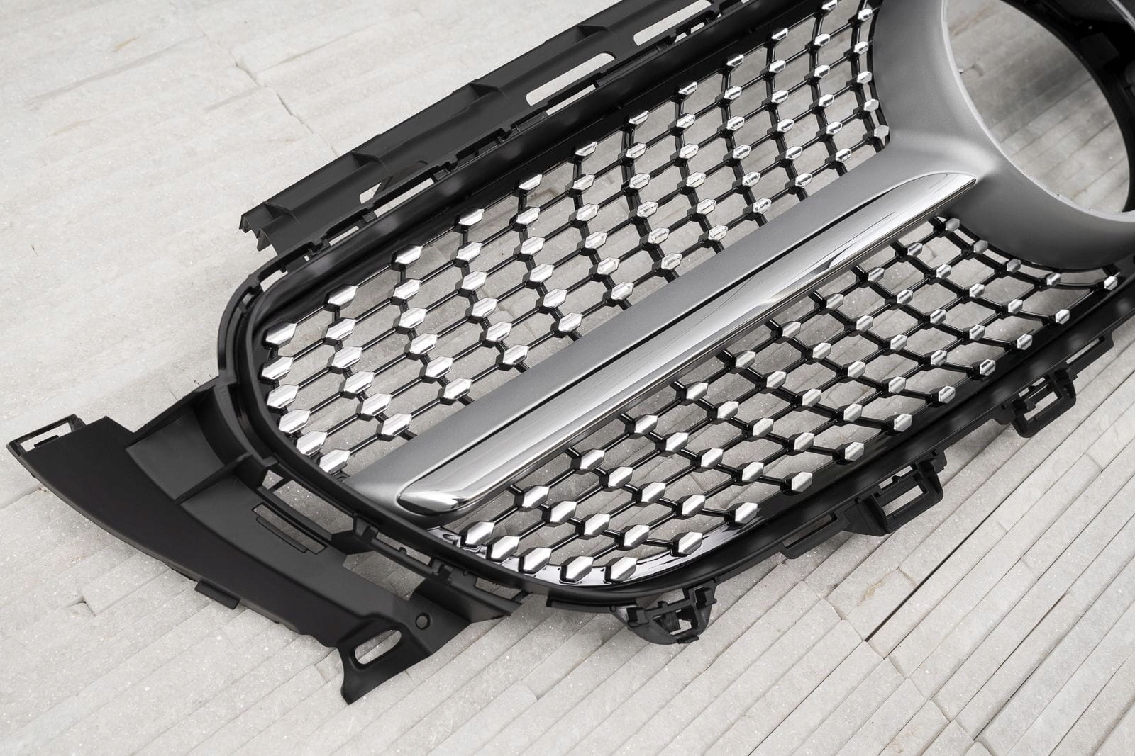 Специальная решетка идеально сочетается с элегантностью Mercedes. Сетка гриля украшена серебряными штифтами, которые радиально расходятся по обеим сторонам элемента, придавая ему впечатляюще оригинальный стиль, характерный для самых роскошных моделей. Элемент заполняет пространство вокруг знака MERCEDES, окружая его элегантной рамкой. Решетка DIAMOND позволяет создать модный, современный стиль вашего автомобиля, подчеркивая стильную душу Е-КЛАССА.