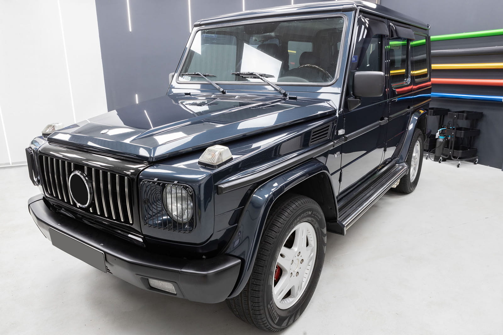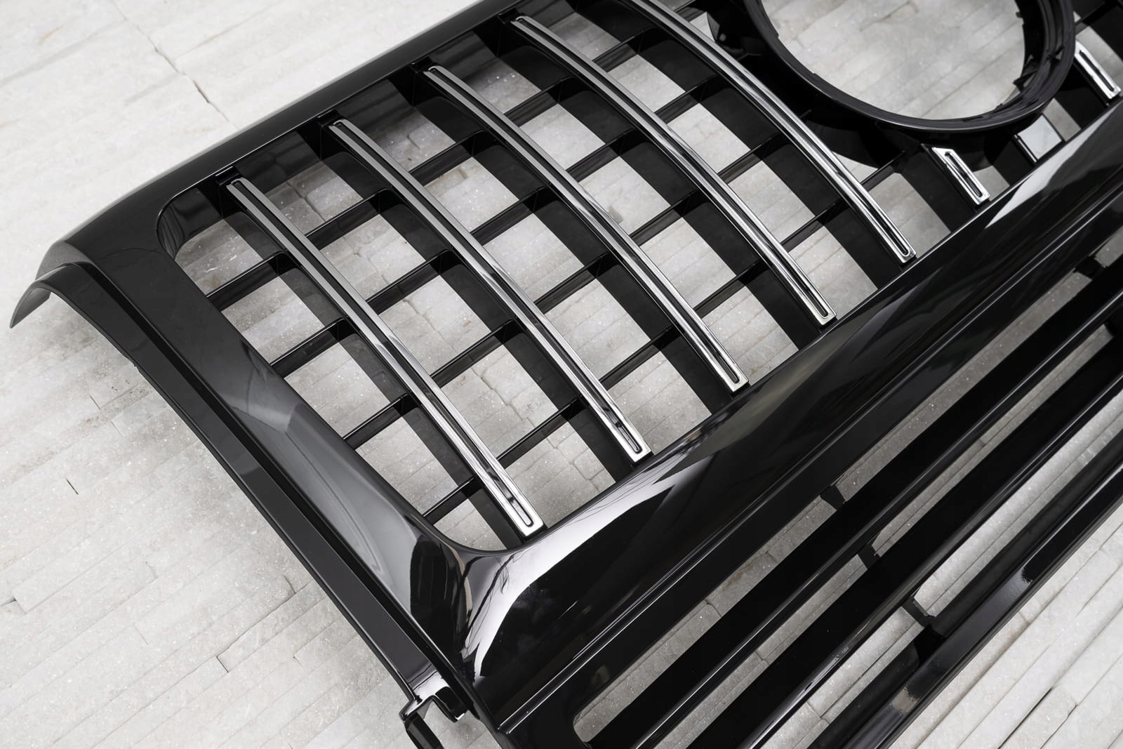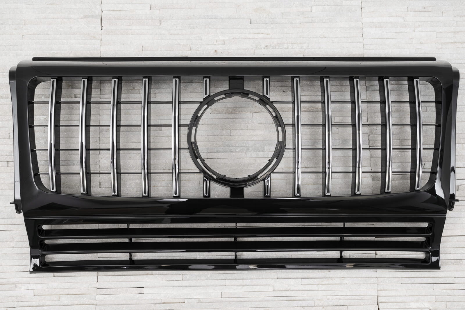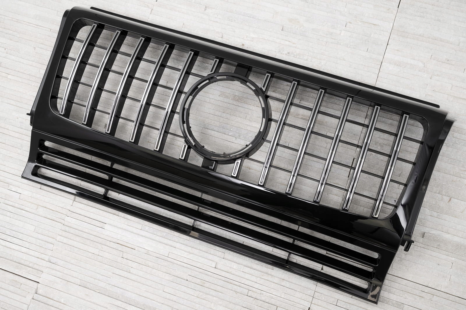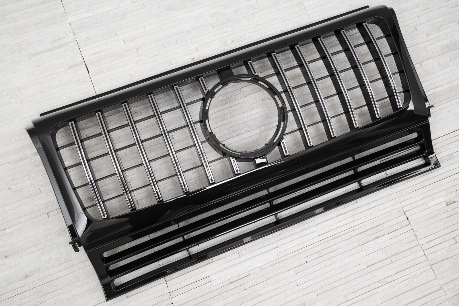 Специальная решетка радиатора выполнена в стиле, типичном для автомобилей сегмента GT. Решетка радиатора украшена широкими хромированными поперечинами, которые неизбежно напоминают респектабельные, мощные автомобили топ-класса. Элемент впечатляет своим спортивным характером, а блеск хромированных элементов добавляет элегантности – благодаря чему решетка GT прекрасно дополняет стиль Mercedes G-Class.
