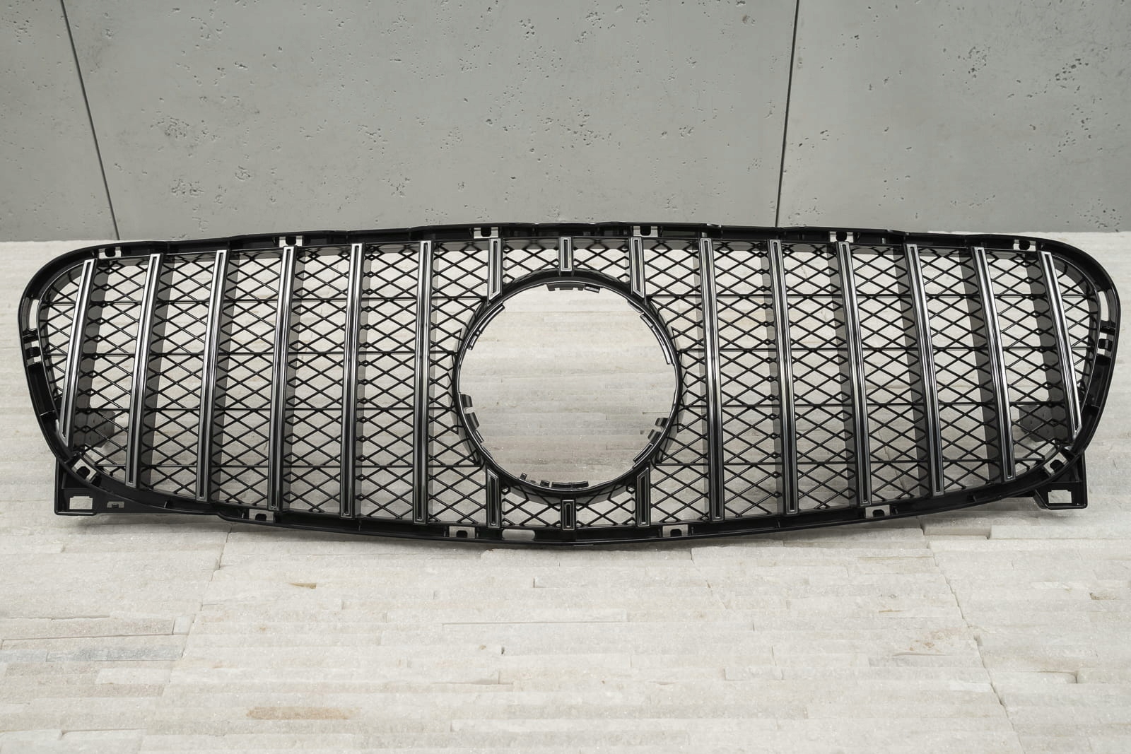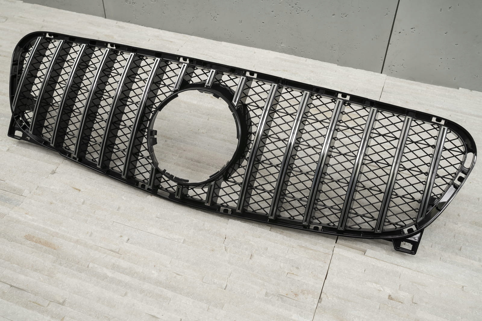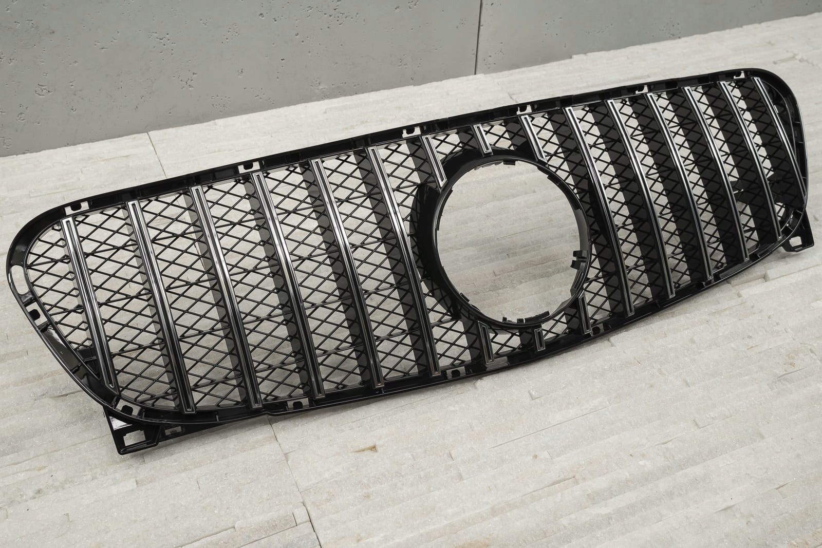 Решетка радиатора, модель GT/PANAMERICANA, разработанная для модели MERCEDES GLA X156 2014-2016 гг. (ДО ВЕРСИИ ФЕЙСЛИФТИНГА, БЕЗ ЗАВОДСКОЙ КАМЕРЫ)