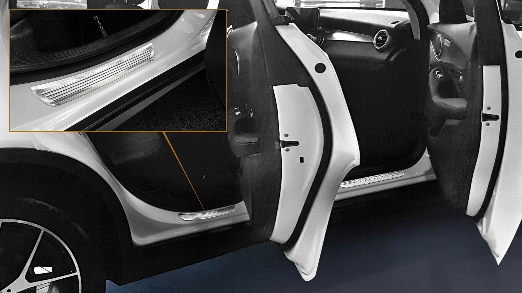 боковые юбки изготовлены из высококачественной шлифованной нержавеющей стали, устойчивой к суровым погодным и дорожным условиям (соль, песок, влага).Благодаря идеальному соответствию форме подоконника, установка планок чрезвычайно проста и выполняется с помощью качественной двусторонней ленты. Лента уже наклеена на изделие. Они защищают краску на пороге автомобиля от царапин и повреждений, возникающих при входе и выходе. Кроме того, они являются оригинальным и элегантным дополнением интерьера любого автомобиля.