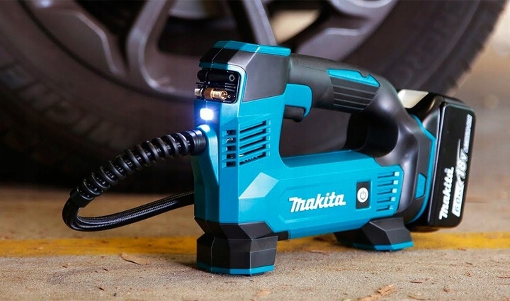 аккумуляторный мини-компрессор 18V DMP180Z Makita маленький компактный компрессор. Его основная задача-прокачивать автомобильные колеса, велосипедные, мячи и матрасы. Его компактные размеры позволяют перевозить его в багажнике автомобиля, он не занимает много места. Компрессор питается от литий-ионной батареи 18 в серии LXT. Беспроводная работа позволяет не только использовать его в гараже, но и в полевых условиях.п>