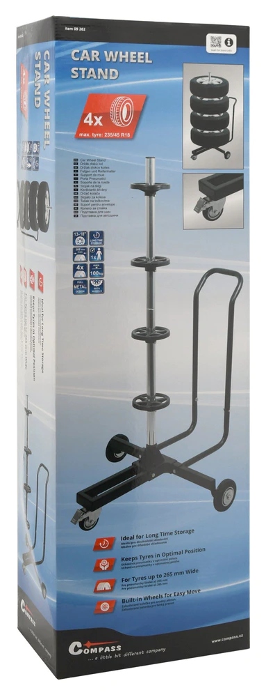 держатель колеса, идеально подходит для длительного хранения зимних или летних шин . Кроме того, одно из колес тормозится, поэтому ручка не сдвинется случайно. Благодаря металлической конструкции стабильность устройства гарантируется даже при полной нагрузке. Простая установка ручки для легкого и быстрого использования. Предназначен для 4 колес с шинами 13 " -18 " (макс. 235/45 R18).