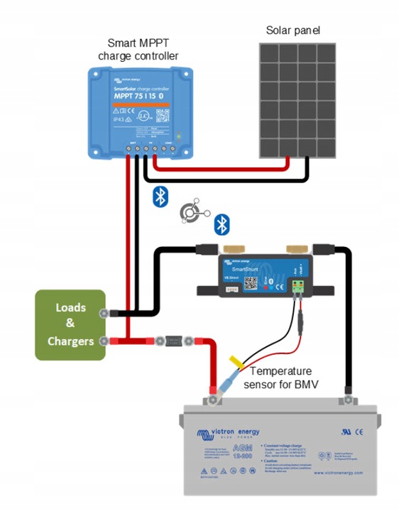 - SmartShunt оснащен чипом Bluetooth, портом VE.Direct и разъем, который можно использовать для: мониторинга второй батареи, мониторинга промежуточной точки или подключения датчика температуры.