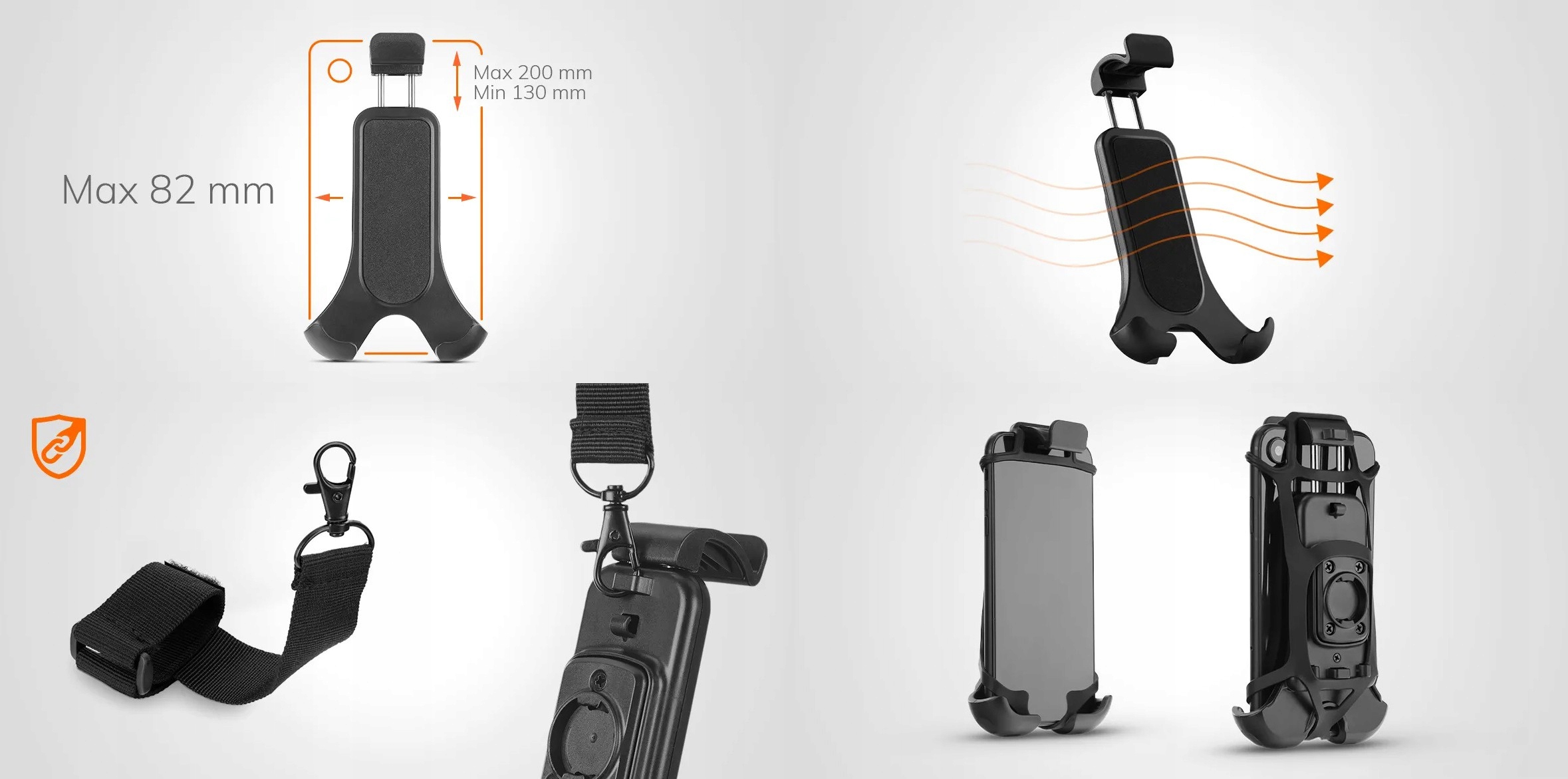 подходит для крепления зеркала и поперечины диаметром от 9 до 18 мм. Полностью регулируемый, позволяет использовать смартфон по вертикали и горизонтали. Специально для аксессуаров Optiline