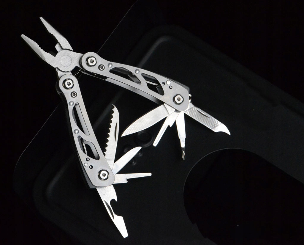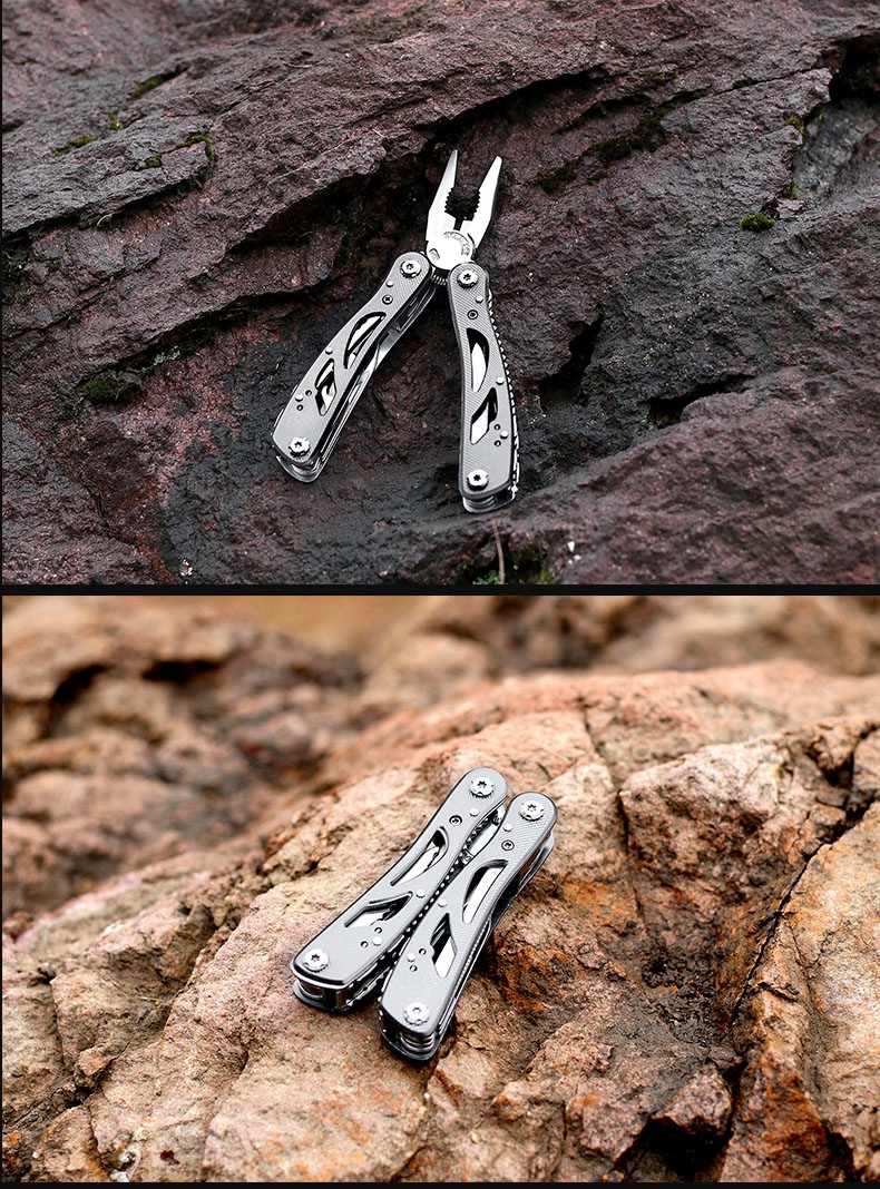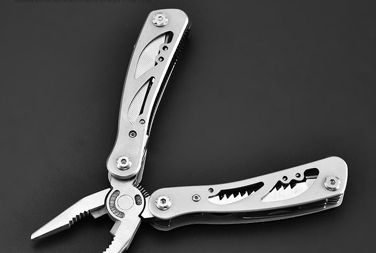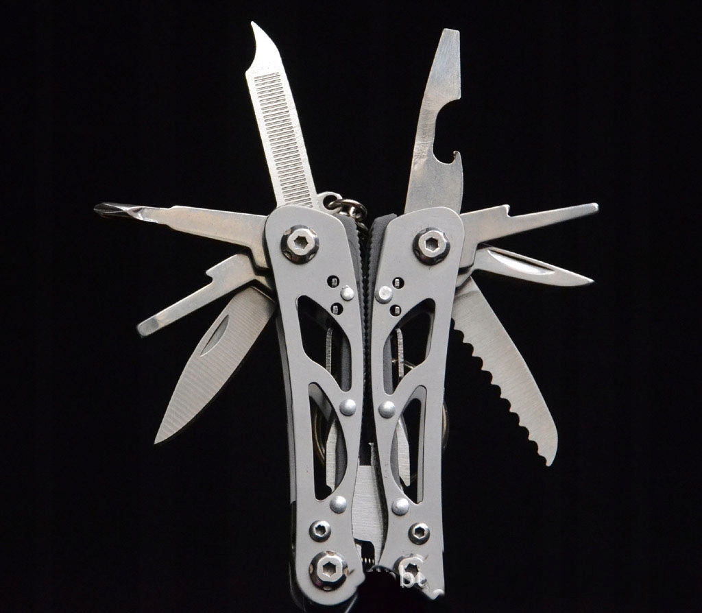 прочный мультитул с набором инструментов для полевых работ, рыбалки или кемпинга. Помимо плоскогубцев с возможностью резки проволоки, имеет 3 отвертки, нож, напильник, открывалка для бутылок, консервов, клинок зазубренный, толкатель для крючков и скребок для рыбы