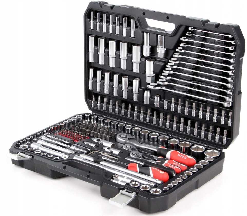 набор инструментов, который был разработан для удовлетворения потребностей автомобильных и механических услуг. торцевые ключи , как и привод торцевых головок, изготовлены из прочной инструментальной хромованадиевой стали CrV 50bv3. Колпачки изготавливались методом штамповки, и перед процессомзакалки они подвергались калибровке с помощью точных измерительных приборов и контрольных устройств.. Колпачки оснащены системой AS-Drive, увеличивающей максимальный крутящий момент на 25% , при полной защите кромок гаек, колпачки с двухтональной отделкой поверхности. В комплект также входят биты из твердой стали S2. Комплект обеспечивает работу, требующую сверхвысоких нагрузок и точности, позволяет выполнять множество сервисных операций, связанных с отвинчиванием и завинчиванием резьбовых соединений различных номинальных размеров. Погремушки имеют трехкомпонентную рукоятку и 72 зубца (рабочий ход 5 градусов).п>