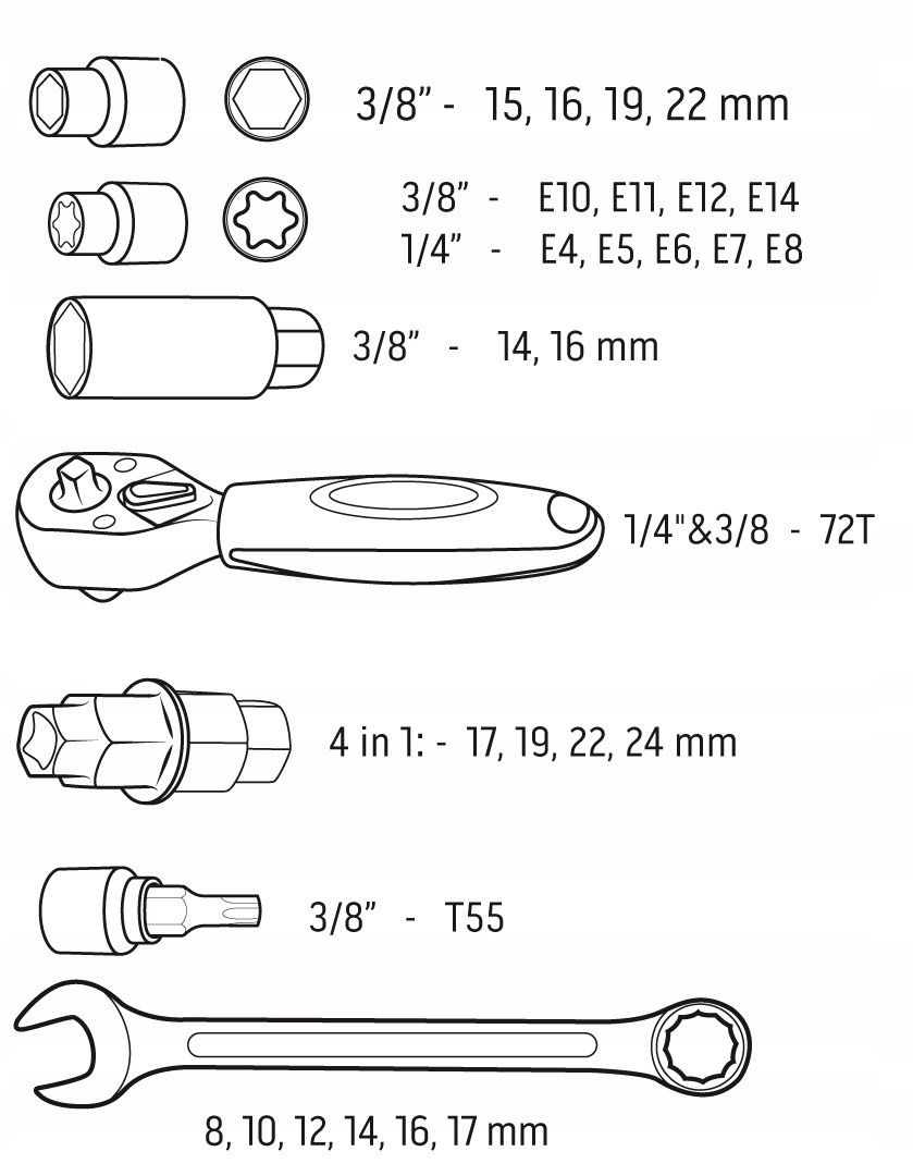 Набор инструментов для мотоцикла, 25 предметов, мягкий кейс 10-500 NEO — удобный набор инструментов и аксессуаров, рекомендуемый любителям автомобилей и двухколесных транспортных средств. Он включает в себя, среди прочего: универсальные комбинированные ключи, шестигранные головки, торцевые головки, трещотки или инструмент 4 в 1 для осей мотоциклов. Каждый элемент изготовлен из высококачественной стали CS. В набор входят изделия разных размеров, поэтому его можно использовать для различных марок и моделей мотоциклов. Все это дополнительно предлагается в практичном мягком кейсе с отделениями для облегчения порядка и удобного использования инструментов. Фирменный набор NEO рекомендуется профессионалам и любителям DIY.