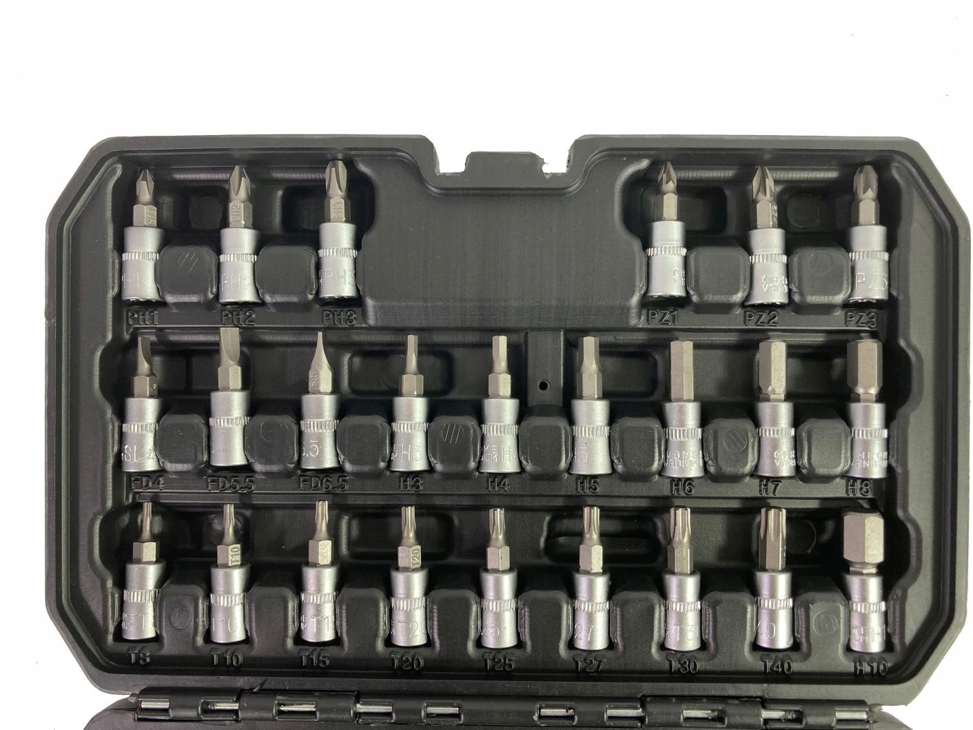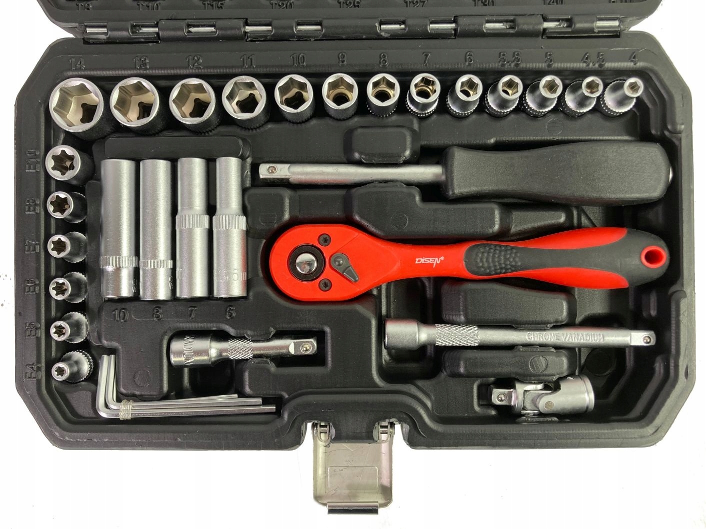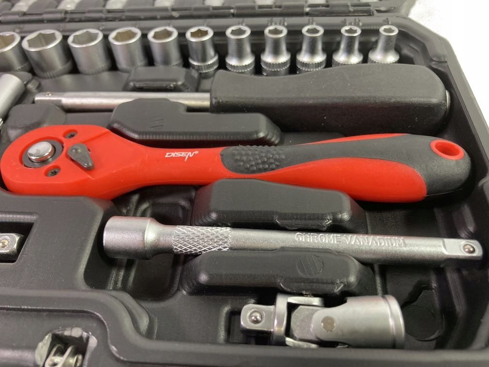 В комплект входит трещотка с прочным храповым механизмом. В комплекте имеется широкий ассортимент насадок (размерами от . от 4 до 14 мм) и свечные головки, насадки-отвертки (плоские, крестовые, шестигранные, Torx). В комплекте также имеется удлинитель, кардан и держатель бит. Элементы разложены как в практичном чемоданчике, так и в любительском. Профессиональное производство и закаленная хромованадиевая сталь обеспечат. надежность и долговечность Все размеры клавиш отмечены для удобства пользователя.