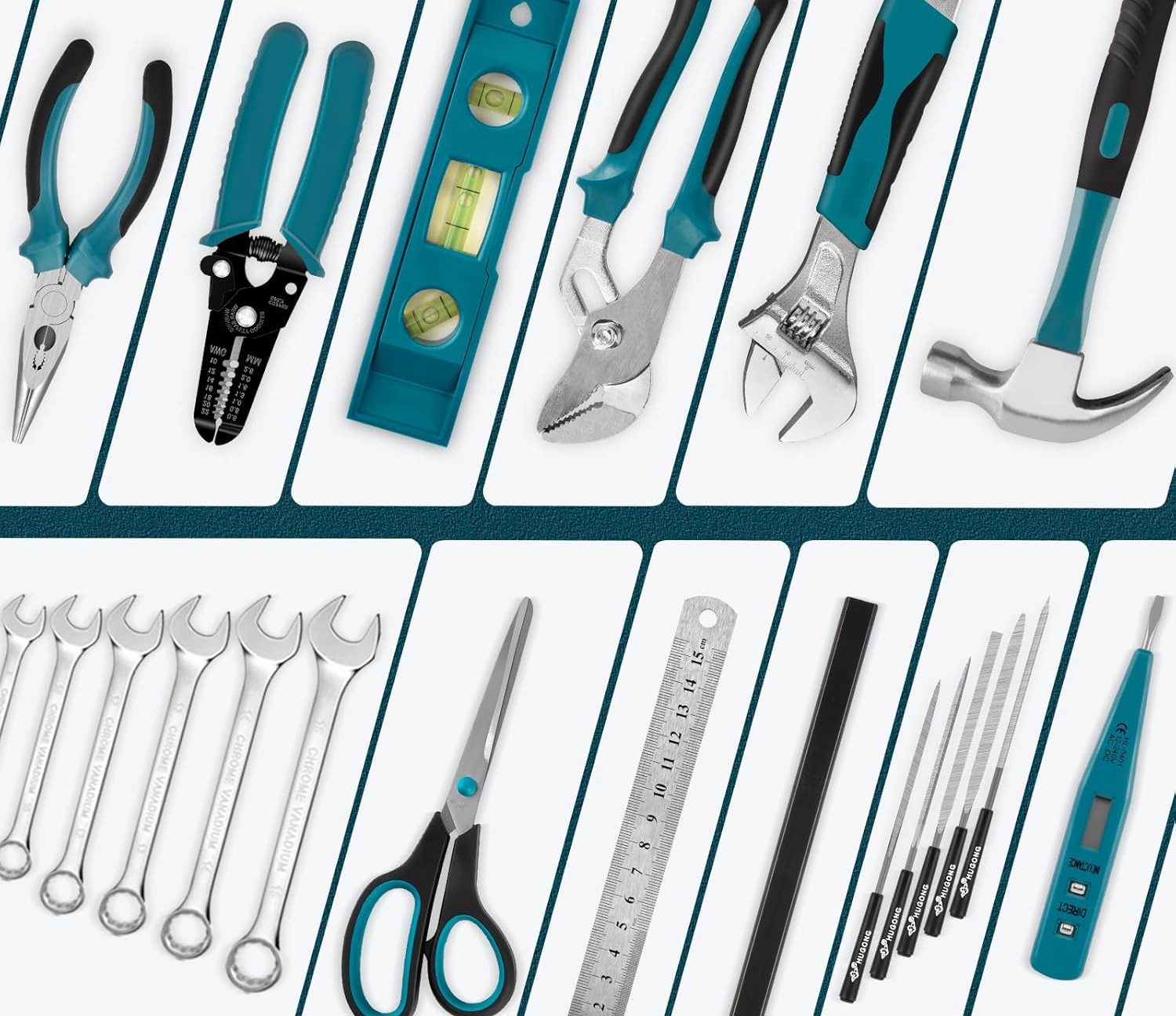 Широкий набор инструментов: в ящик для инструментов входят столярный молоток, спиртовой уровень, рулетка, набор шестигранных ключей, инструмент для зачистки проводов, отвертка, разводные плоскогубцы, набор трещоток, разводной ключ, комбинированные ключи, плоскогубцы, изоляционная лента, набор шурупов по дереву, ножницы, тестер напряжения и другие популярные инструменты.