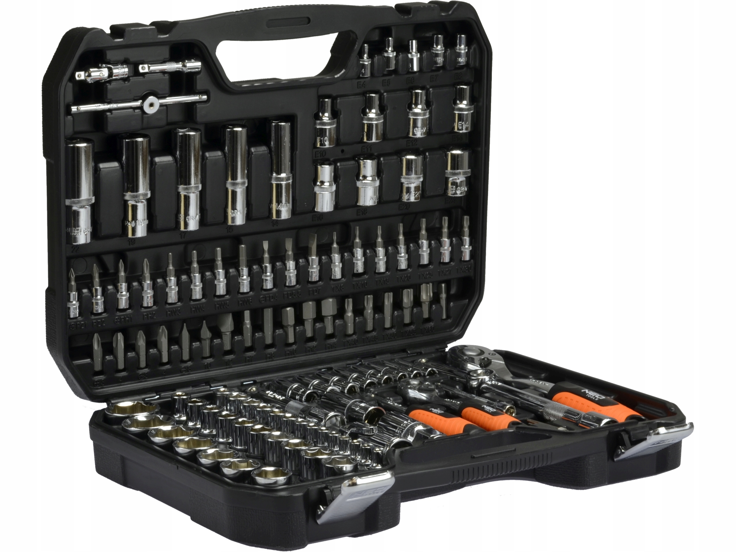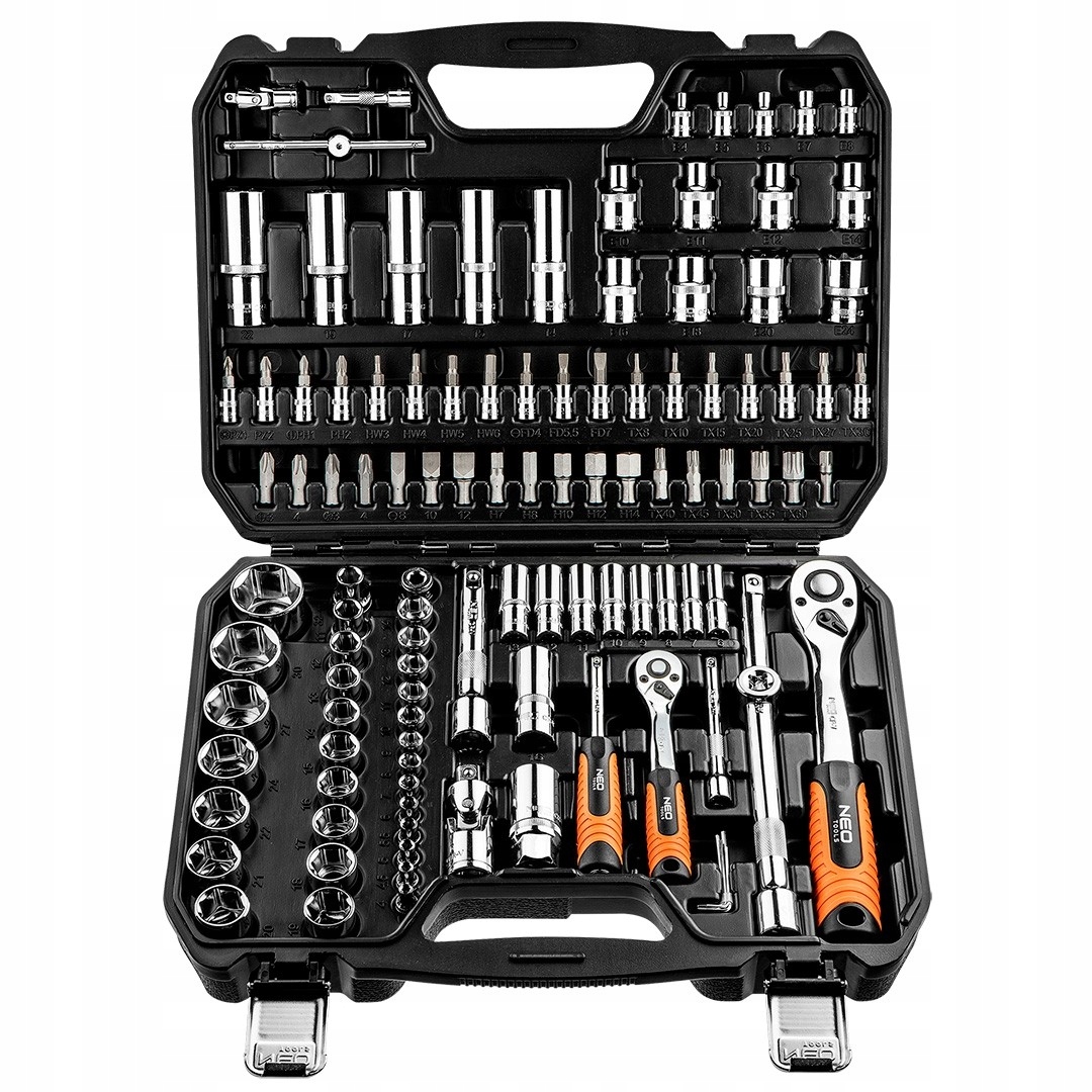 В комплект входит трещотки 1/2" и 1/4" (прочный храповой механизм - 72 зубца) с odgiętymi, эргономичными ручками, а также богатый пакет сменных головок шестигранных двух длин, с сепараторами надписями (размером от 4 до 32 мм), сменных головок Torx (E4 – E24) и сменных наконечников (плоский, крест, шестиугольная, Torx), ключи плоско-кольцевые.п>