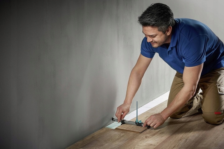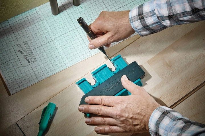 этот инструмент идеально подойдет, например, в ситуации, когда мы хотим вырезать отверстия в панелях для нагревательных труб или аналогичных препятствий. После разблокировки контактных штифтов трафарет кладем на пол и прижимаем к препятствию