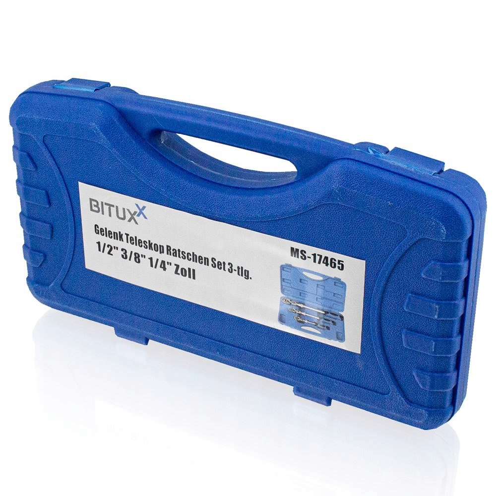 этот набор состоит из 3 телескопических, сломанных (под углом 90°), двухсторонних трещоток в практичном пластиковом футляре.