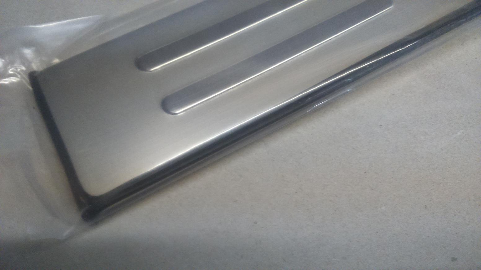 пороговые накладки из полированной нержавеющей стали. В комплекте 4 штуки. Каждый снабжен резиновым уплотнением, обрамляющим всю крышку. Герметизирует и одновременно защищает от попадания мусора между порогом и накладкой. Крепится с помощью двухсторонней клейкой ленты.