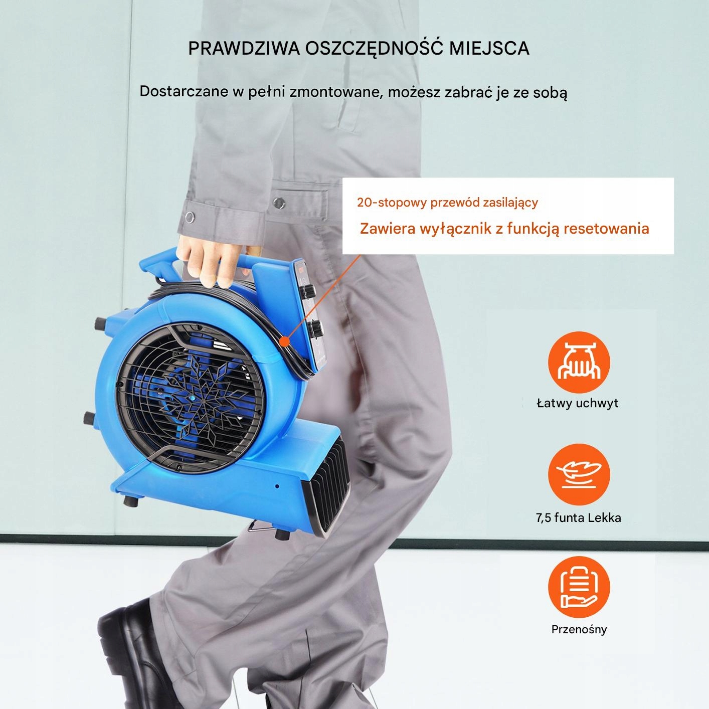 Вентилятор имеет сетевой кабель длиной 7,3 м, что позволяет легко переносить его по комнате одной рукой. Вам больше не придется беспокоиться о потере места. Оптимален для сушки плоских поверхностей и ограниченных пространств.